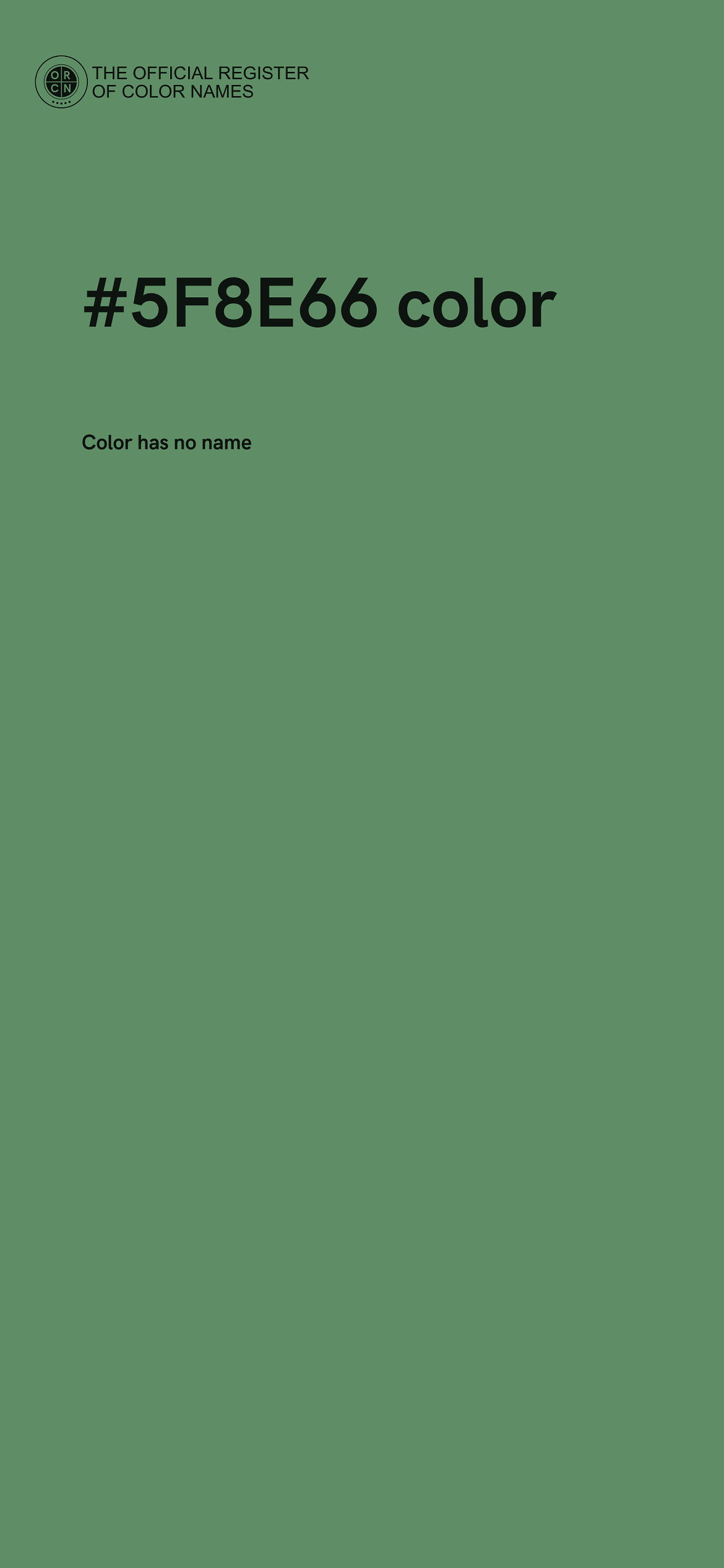 The digital color HEX #5F8E66 belongs to the Green Color Family featuring Low Saturation (Saturation Family) and Light (Brightness Family).