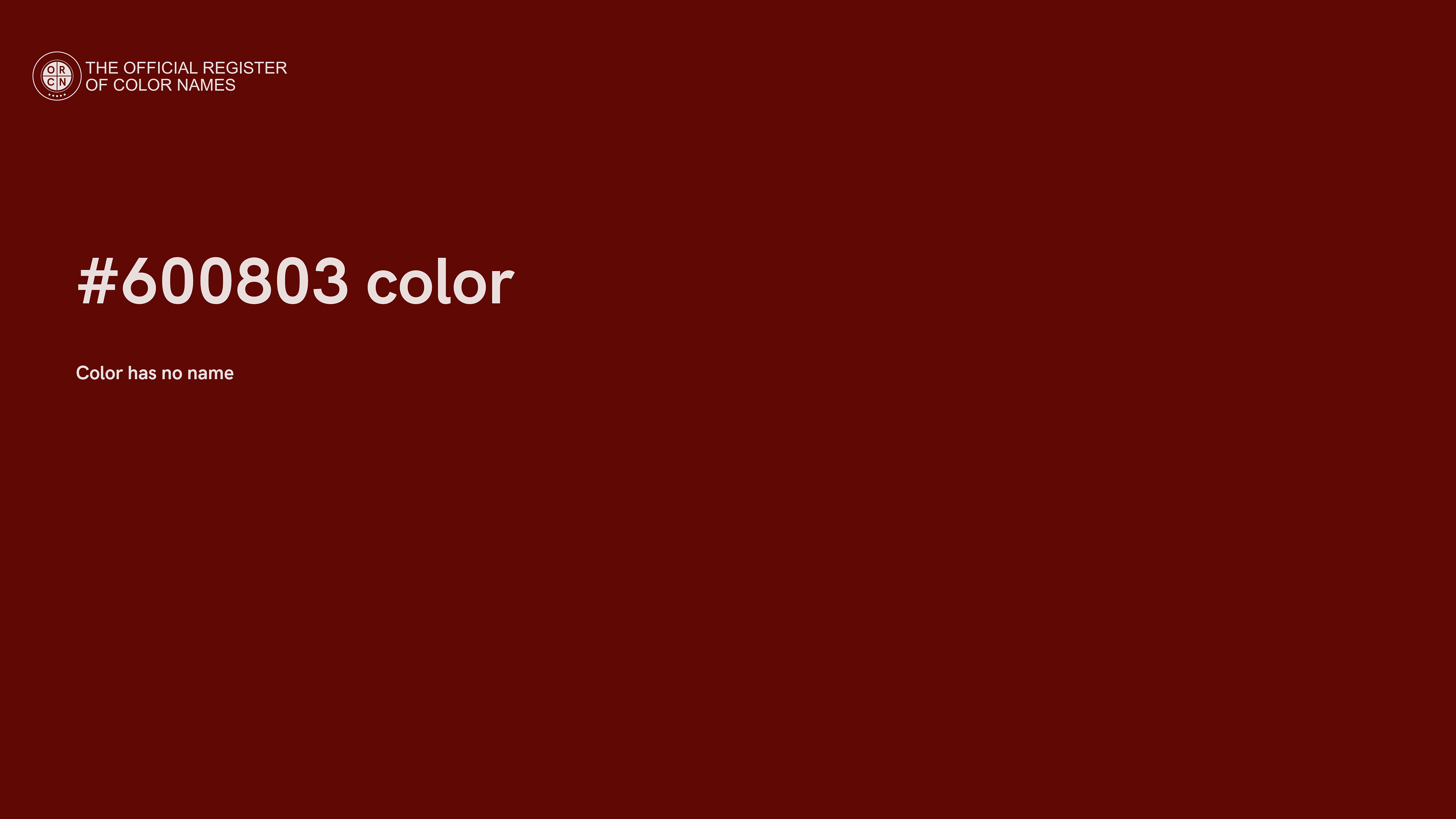 The digital color HEX #600803 belongs to the Red Color Family featuring Full Saturation (Saturation Family) and Dark (Brightness Family).