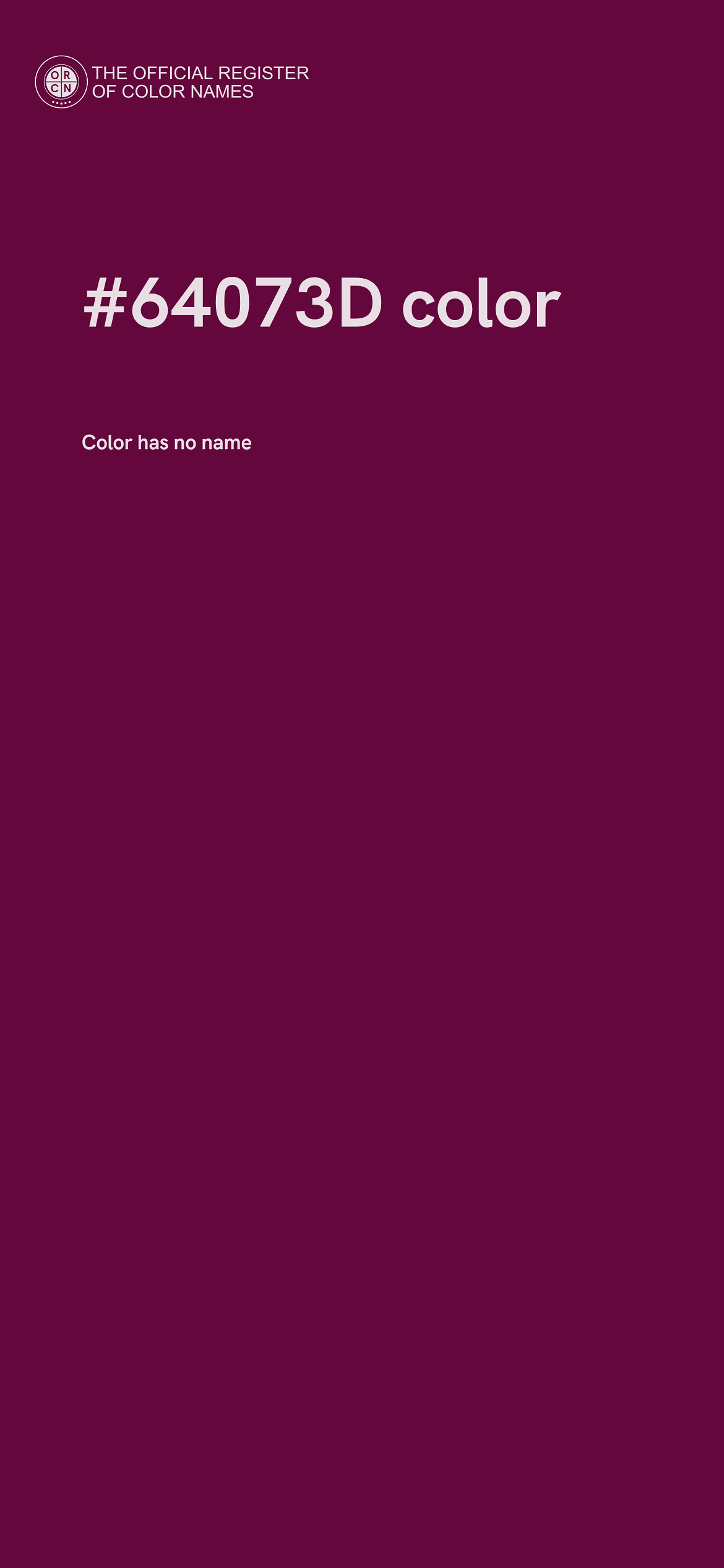 The digital color HEX #64073D belongs to the Rose Color Family featuring Full Saturation (Saturation Family) and Dark (Brightness Family).