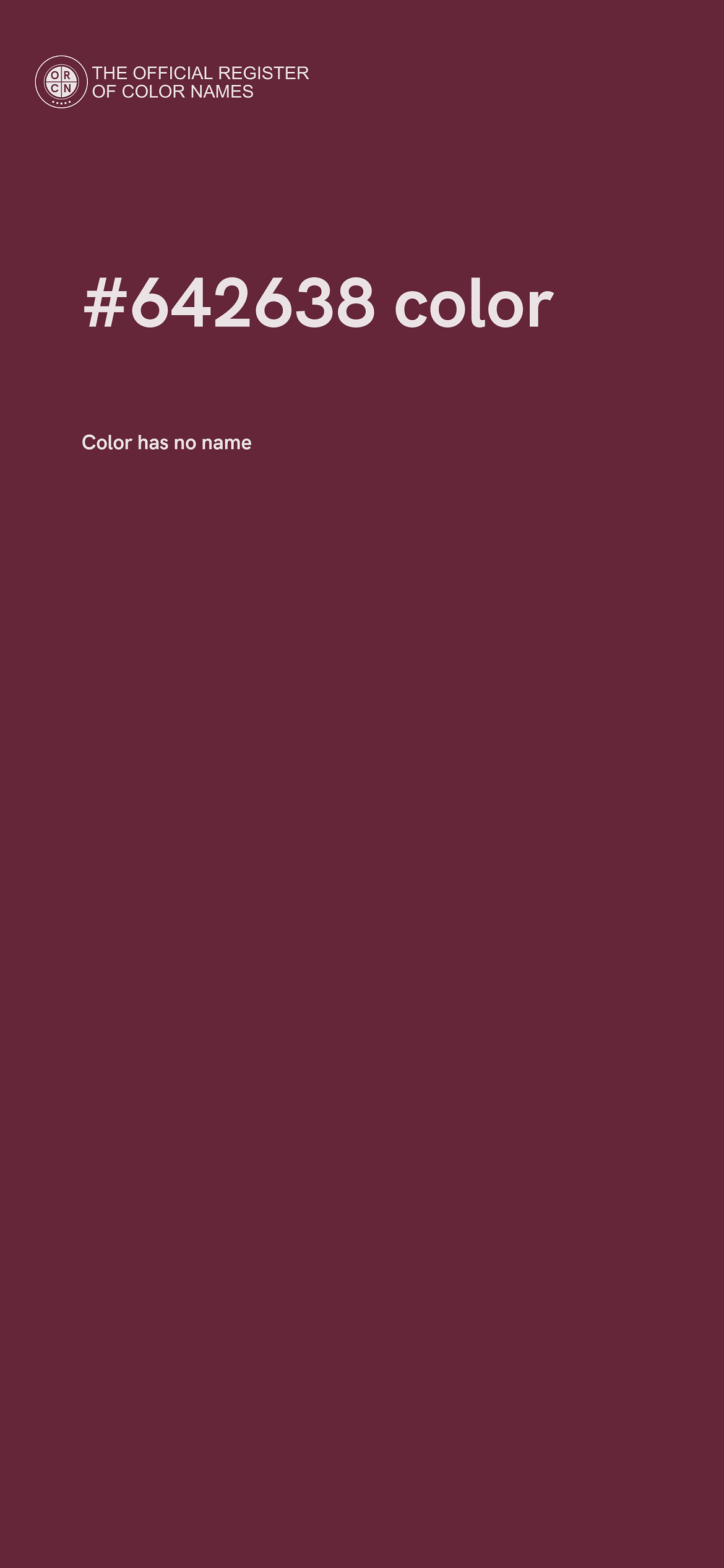 The digital color HEX #642638 belongs to the Rose Color Family featuring Moderate Saturation (Saturation Family) and Neutral (Brightness Family).