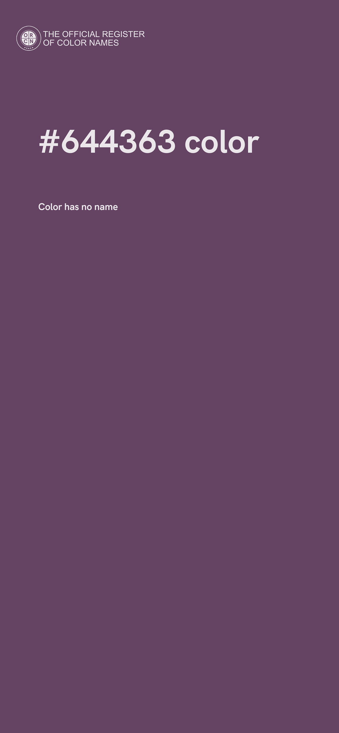 The digital color HEX #644363 belongs to the Magenta Color Family featuring Low Saturation (Saturation Family) and Neutral (Brightness Family).