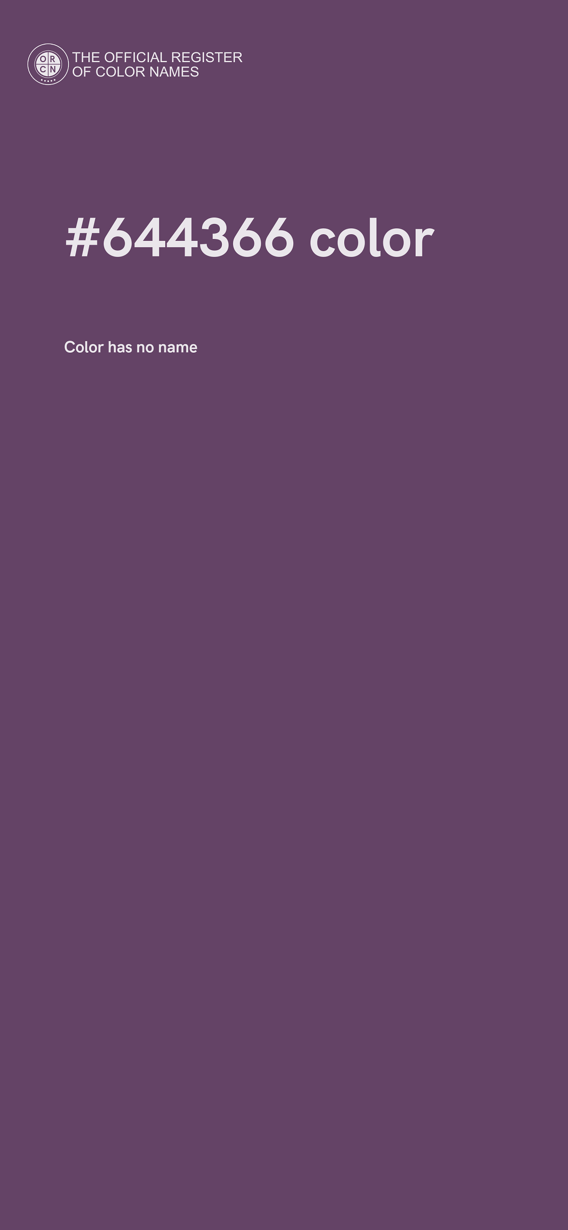 The digital color HEX #644366 belongs to the Magenta Color Family featuring Low Saturation (Saturation Family) and Neutral (Brightness Family).