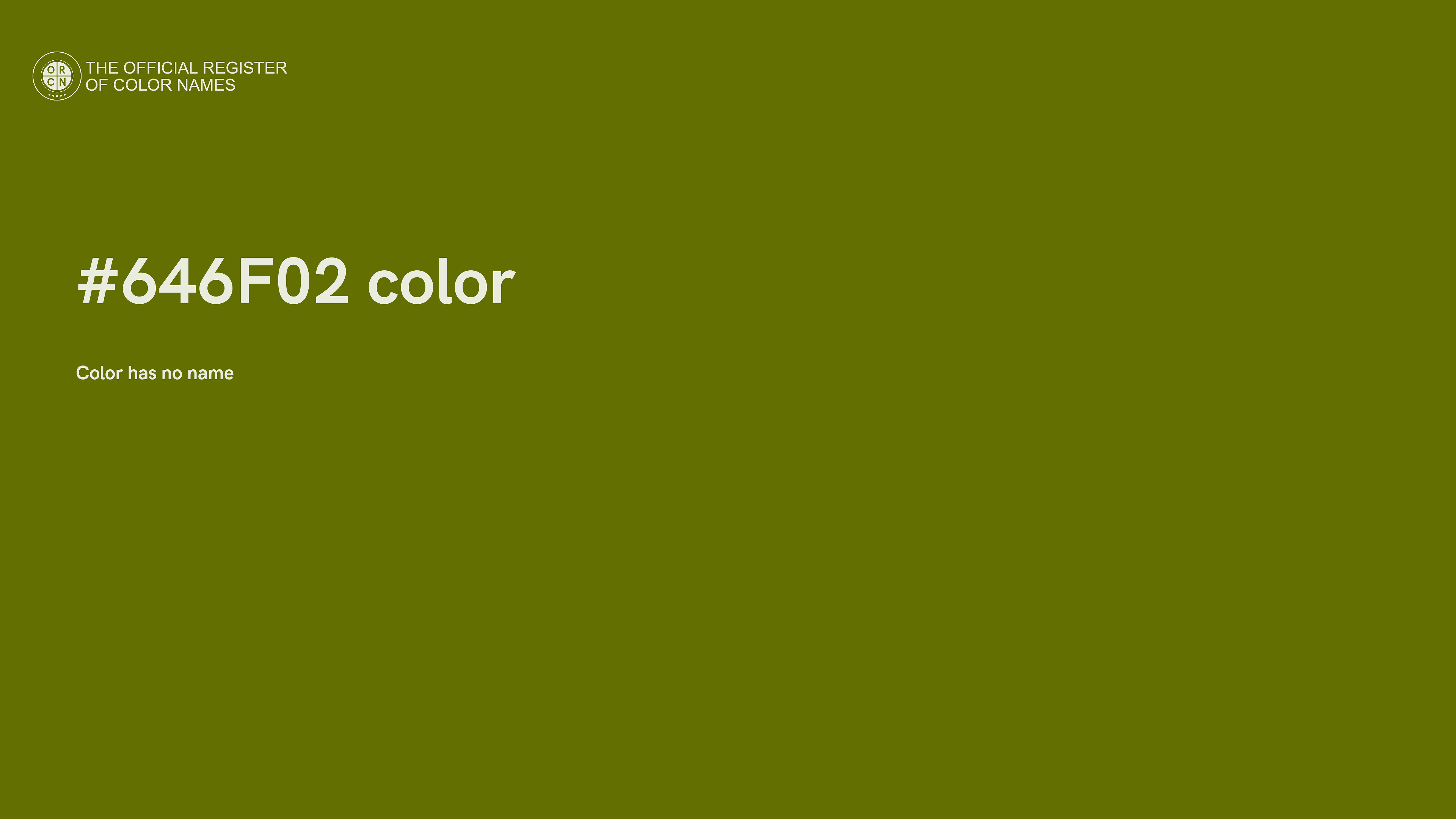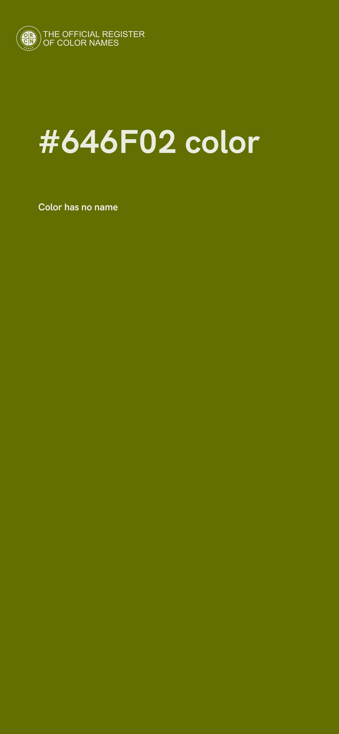 For printing in non digital world, #646F02 is represented in CMYK as 4 Cyan, 0 Magenta, 43 Yellow, and 56 Black (Key) (C:4 M:0 Y:43 K:56).