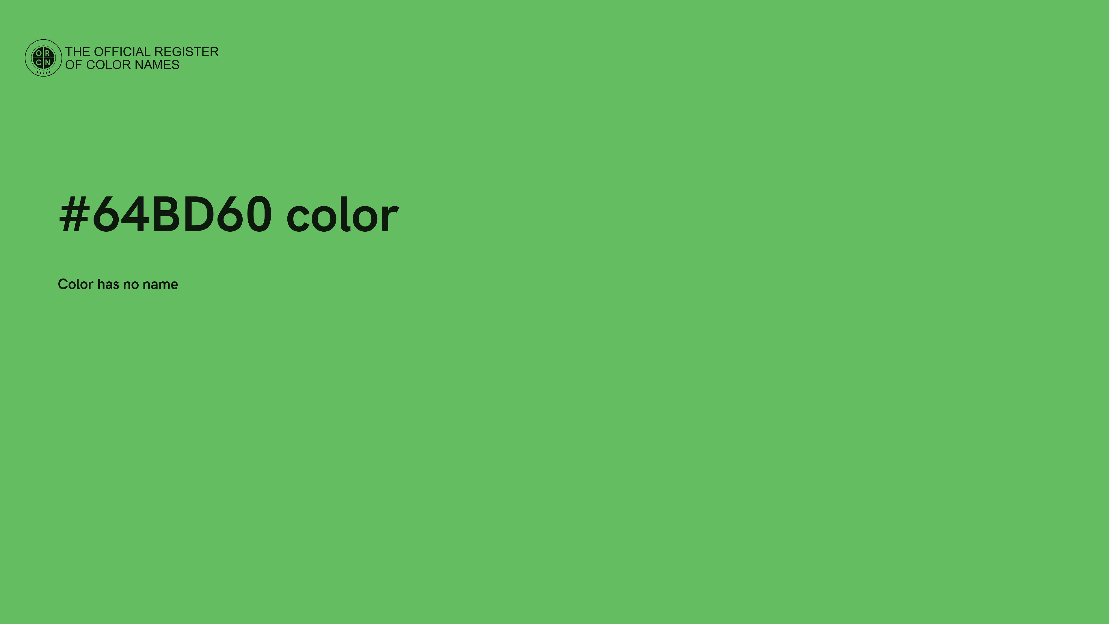For printing in non digital world, #64BD60 is represented in CMYK as 35 Cyan, 0 Magenta, 36 Yellow, and 26 Black (Key) (C:35 M:0 Y:36 K:26).