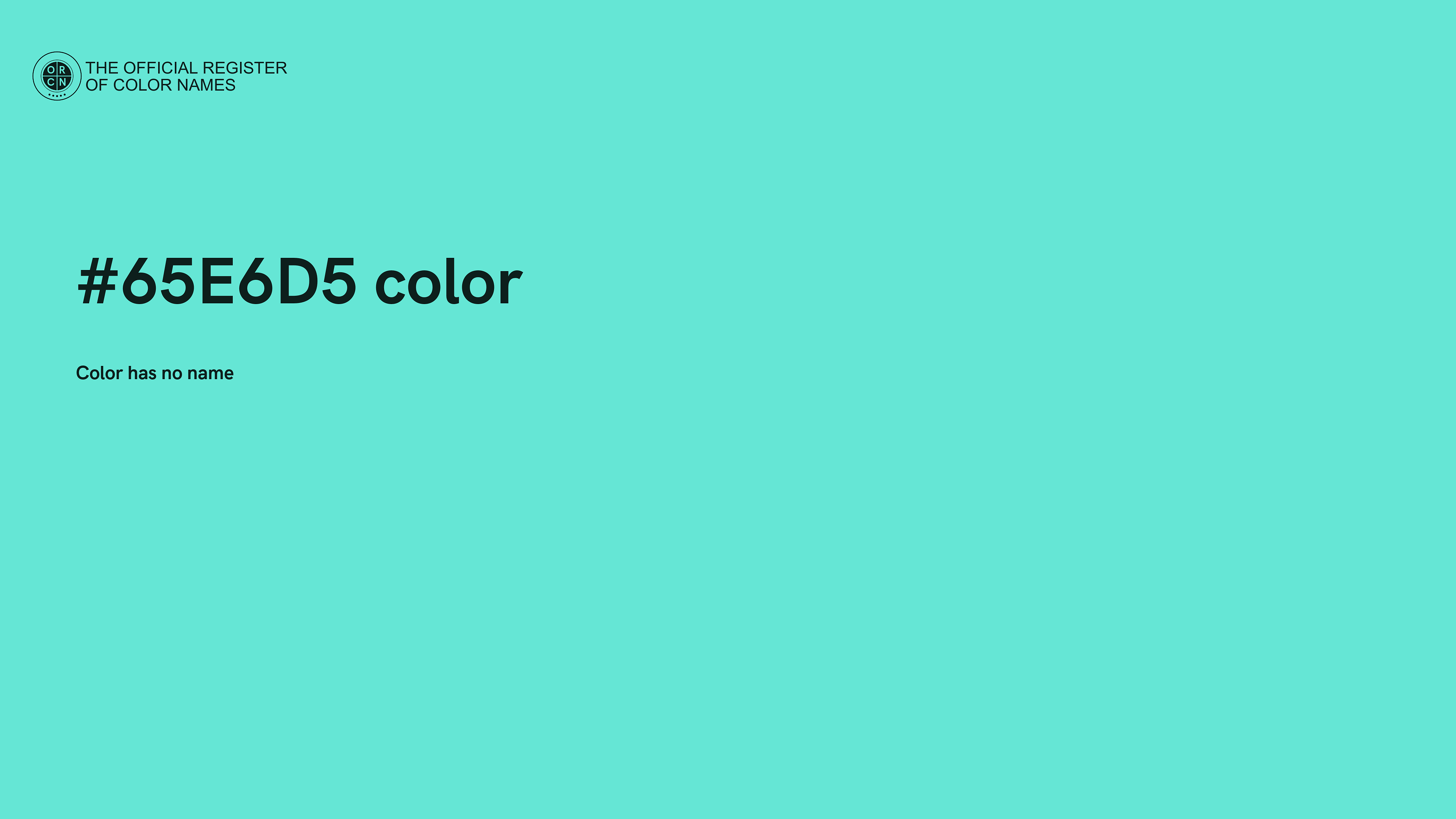 The digital color HEX #65E6D5 belongs to the Cyan Color Family featuring High Saturation (Saturation Family) and Very Light (Brightness Family).