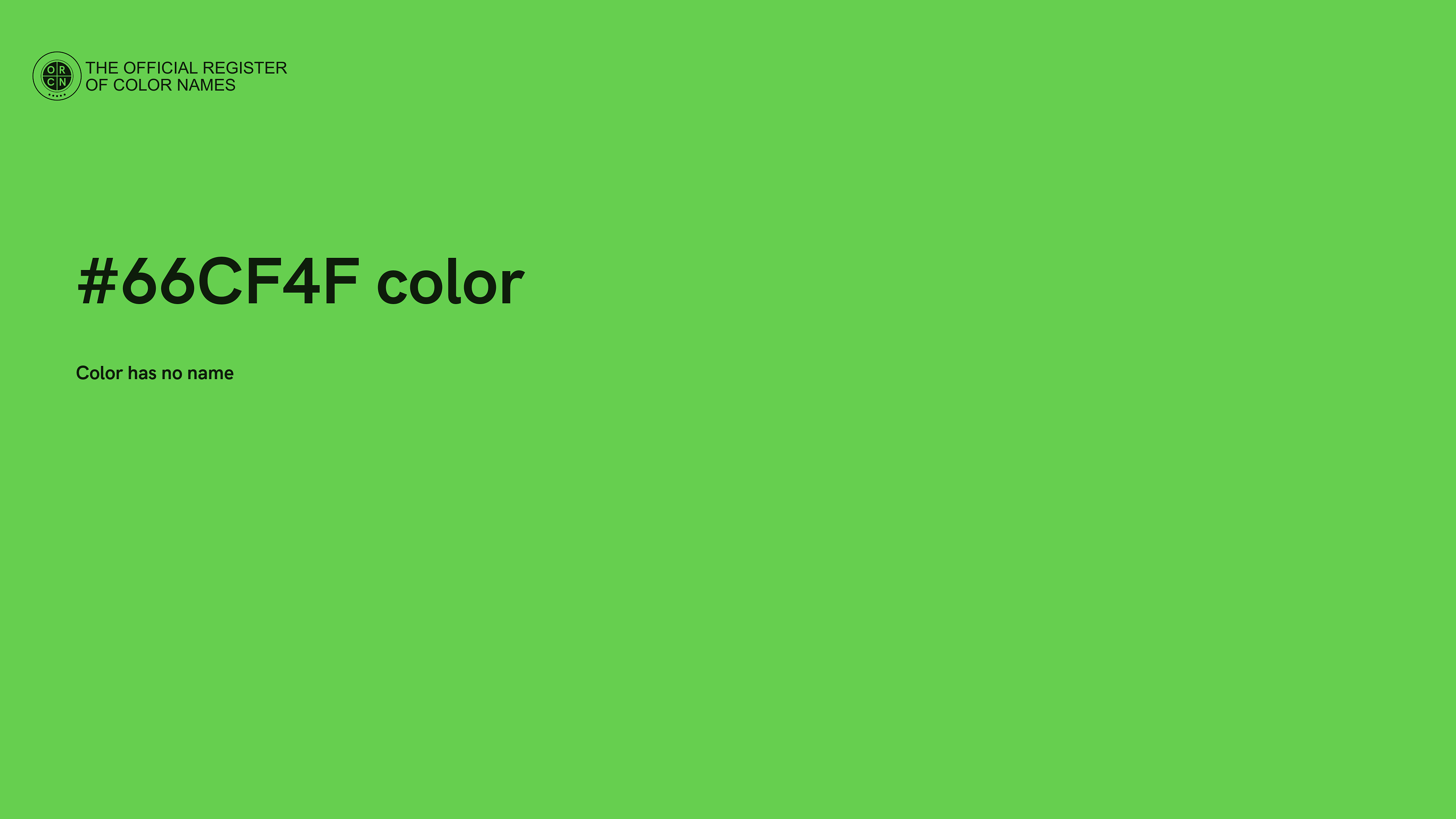 The digital color HEX #66CF4F belongs to the Green Color Family featuring Moderate Saturation (Saturation Family) and Light (Brightness Family).