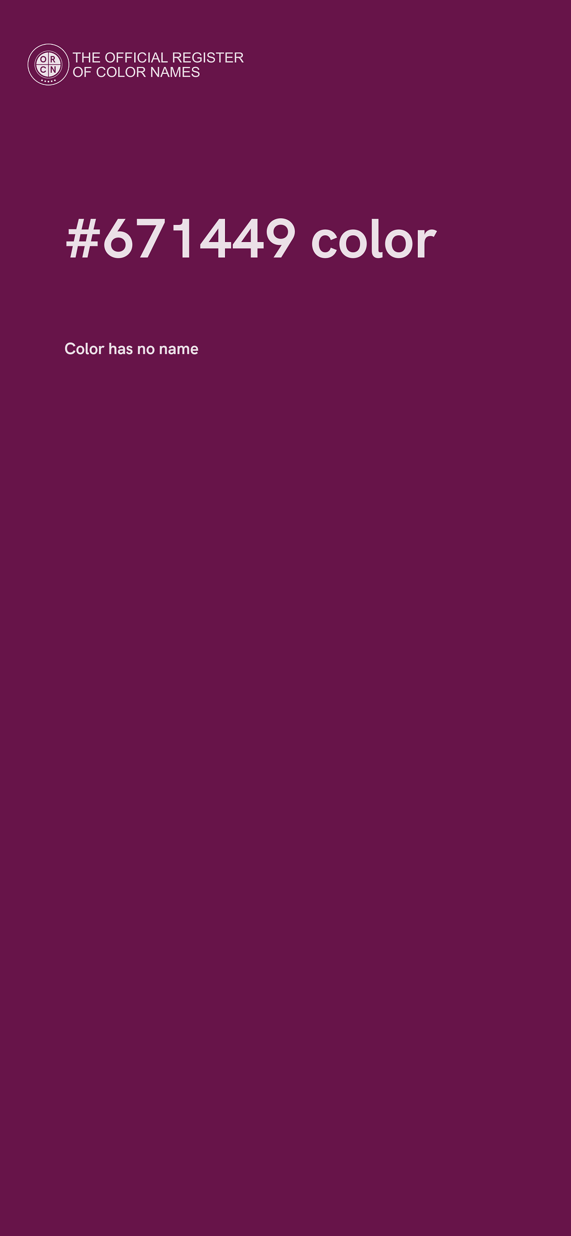The digital color HEX #671449 belongs to the Rose Color Family featuring High Saturation (Saturation Family) and Dark (Brightness Family).