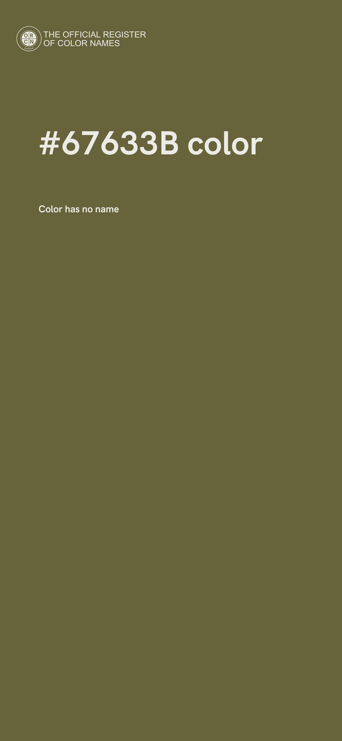 The digital color HEX #67633B belongs to the Yellow Color Family featuring Mild Saturation (Saturation Family) and Neutral (Brightness Family).
