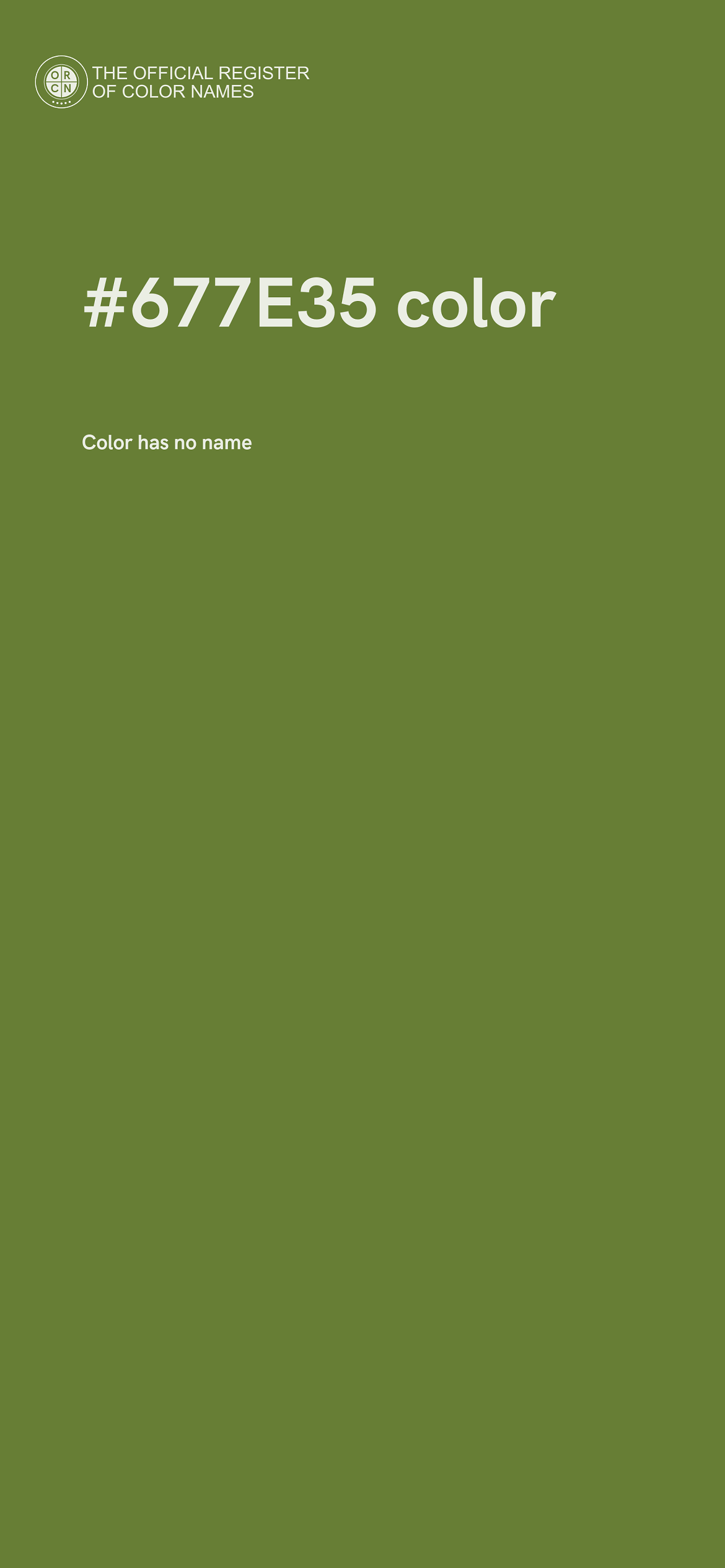 The digital color HEX #677E35 belongs to the Chartreuse Color Family featuring Moderate Saturation (Saturation Family) and Neutral (Brightness Family).