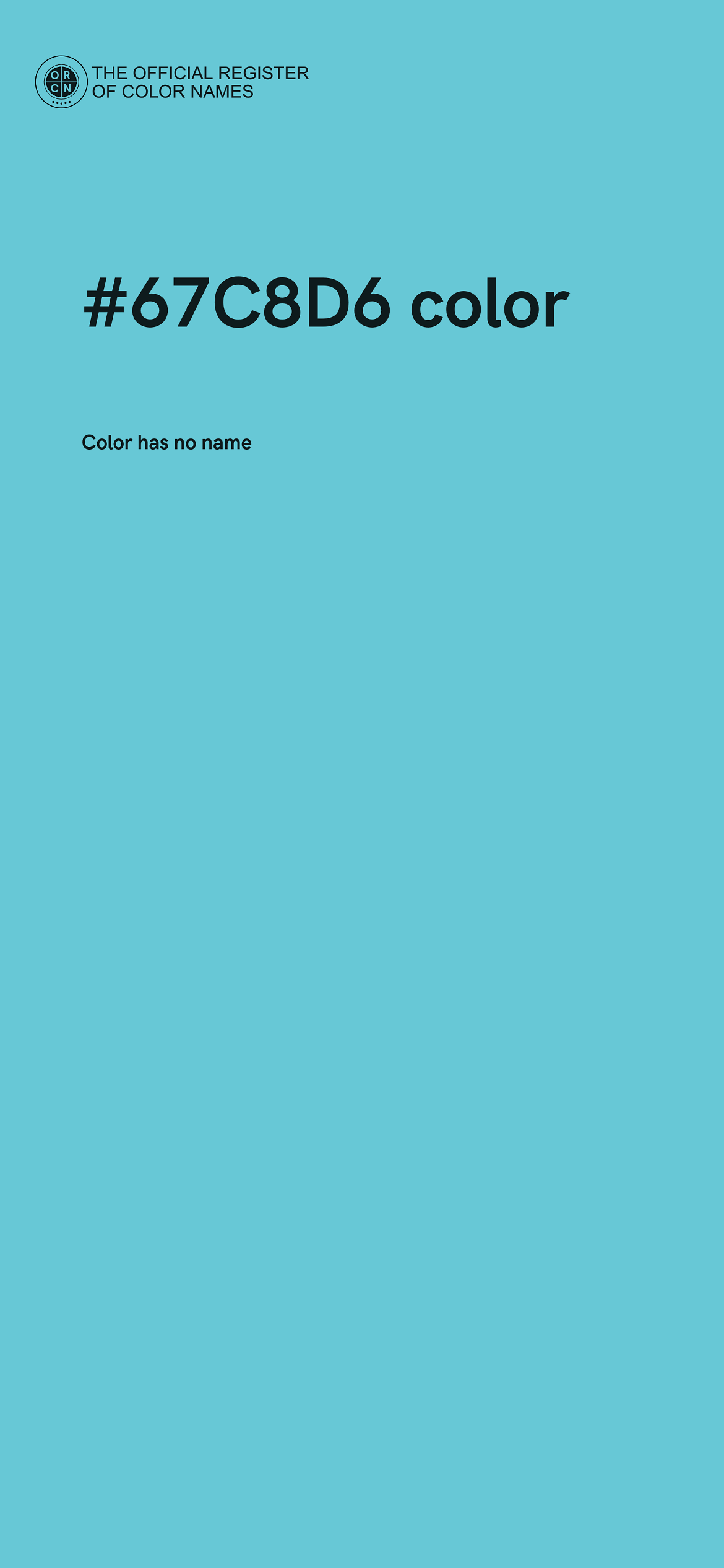 The digital color HEX #67C8D6 belongs to the Cyan Color Family featuring Moderate Saturation (Saturation Family) and Very Light (Brightness Family).