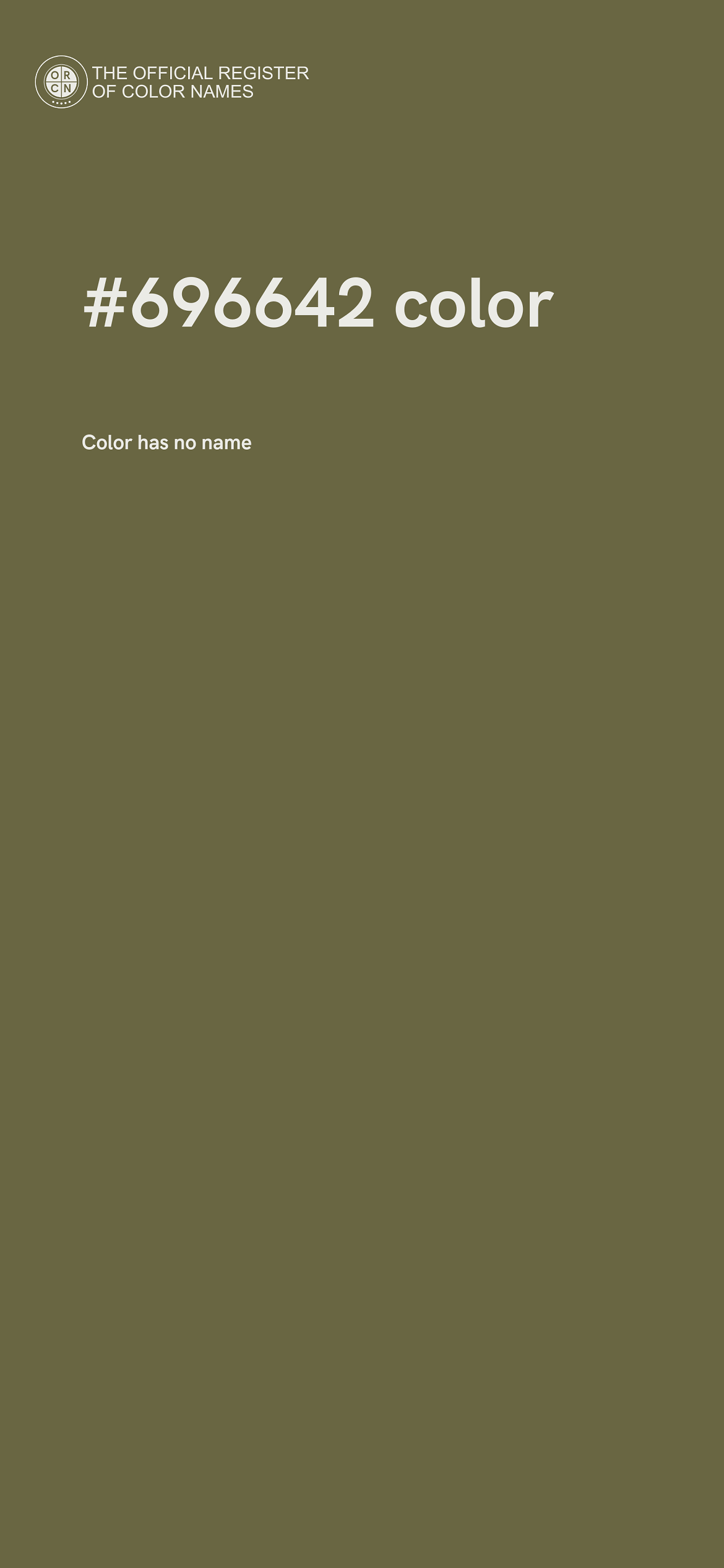 For printing in non digital world, #696642 is represented in CMYK as 0 Cyan, 1 Magenta, 15 Yellow, and 59 Black (Key) (C:0 M:1 Y:15 K:59).