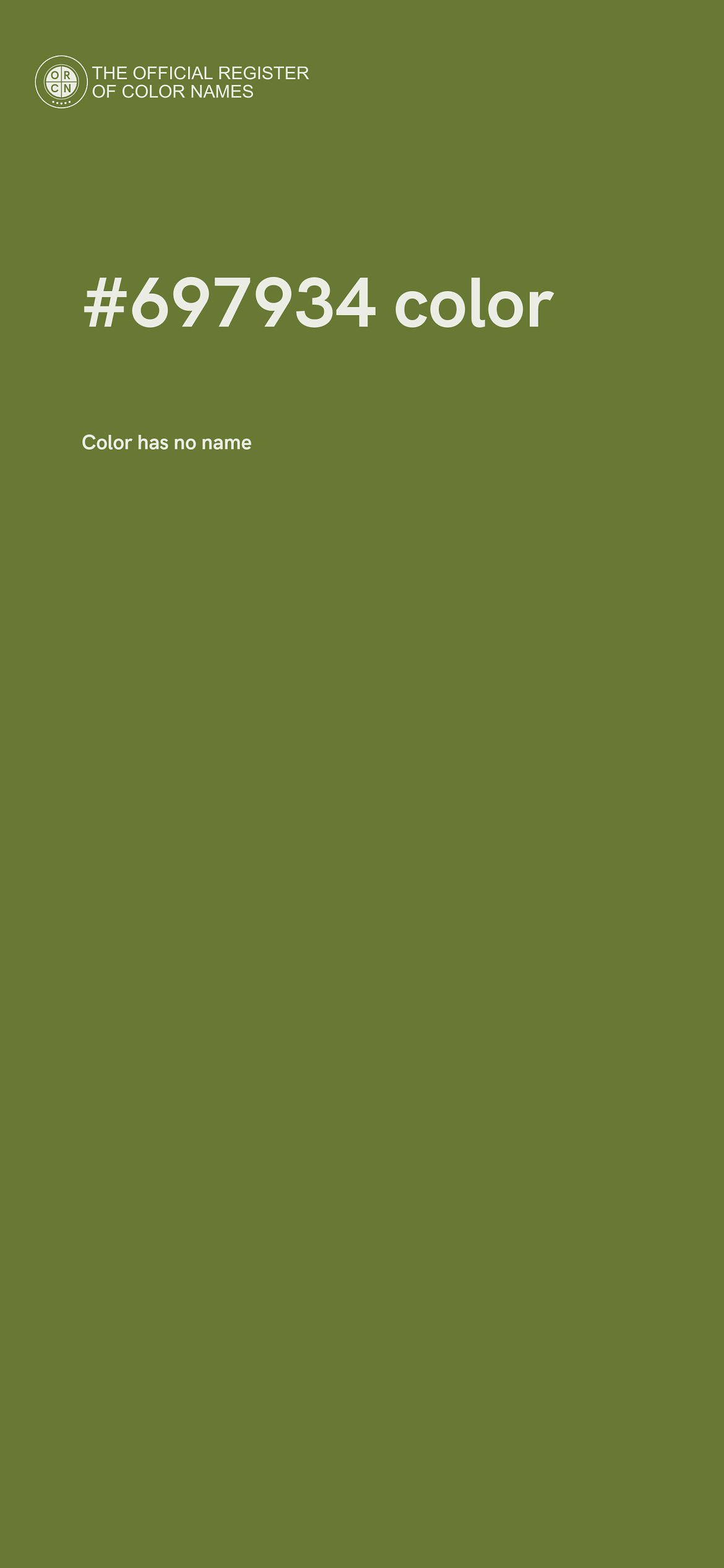For printing in non digital world, #697934 is represented in CMYK as 6 Cyan, 0 Magenta, 27 Yellow, and 53 Black (Key) (C:6 M:0 Y:27 K:53).