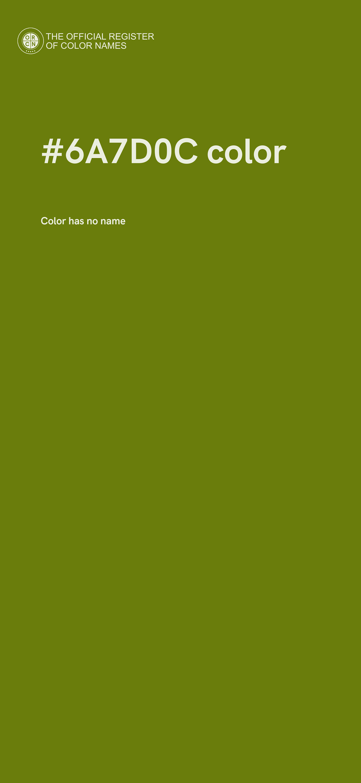 For printing in non digital world, #6A7D0C is represented in CMYK as 7 Cyan, 0 Magenta, 44 Yellow, and 51 Black (Key) (C:7 M:0 Y:44 K:51).