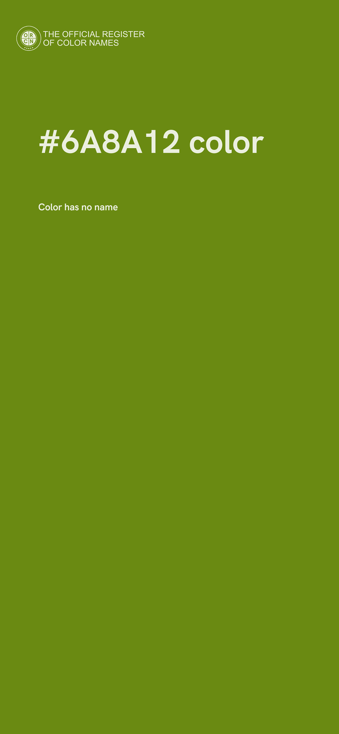 The digital color HEX #6A8A12 belongs to the Chartreuse Color Family featuring High Saturation (Saturation Family) and Neutral (Brightness Family).