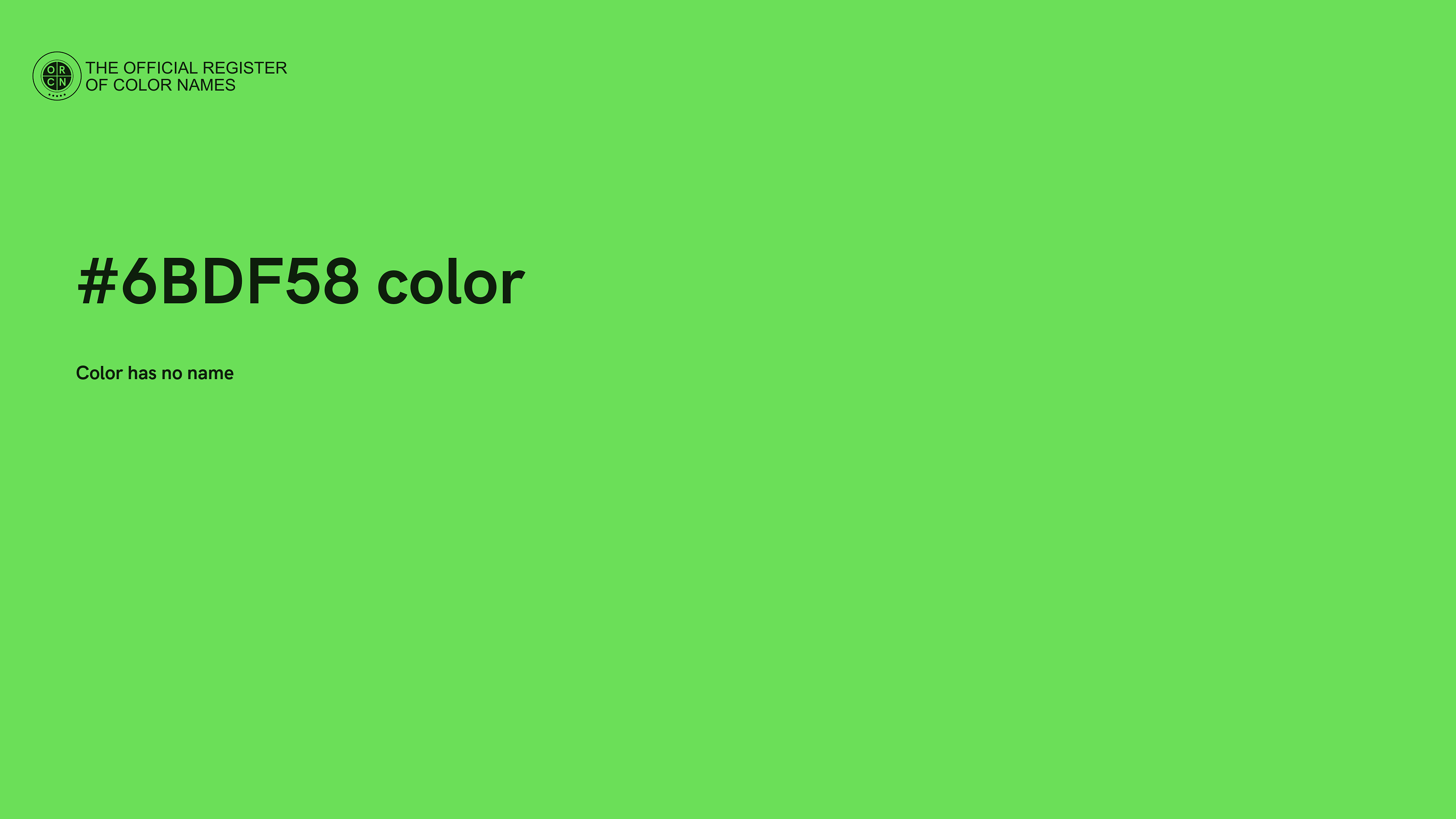 The digital color HEX #6BDF58 belongs to the Green Color Family featuring High Saturation (Saturation Family) and Very Light (Brightness Family).