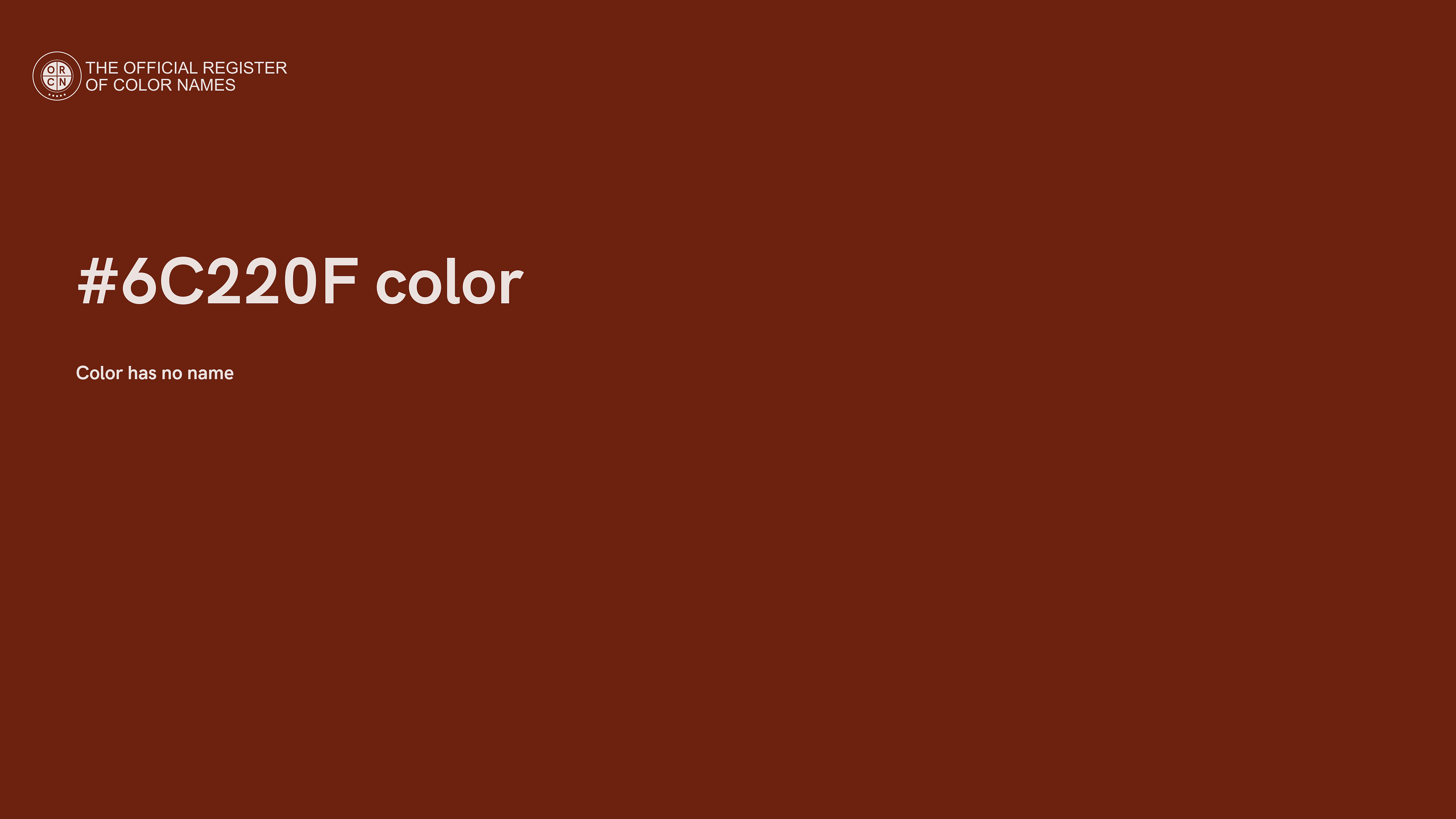 The digital color HEX #6C220F belongs to the Red Color Family featuring High Saturation (Saturation Family) and Dark (Brightness Family).