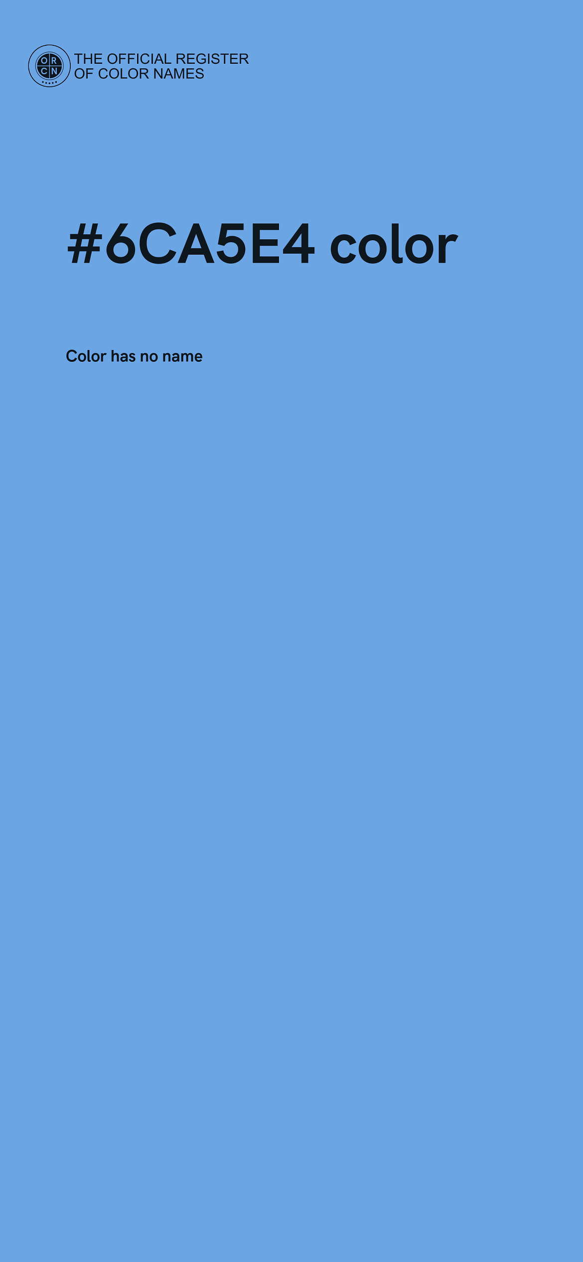The digital color HEX #6CA5E4 belongs to the Azure Color Family featuring High Saturation (Saturation Family) and Very Light (Brightness Family).