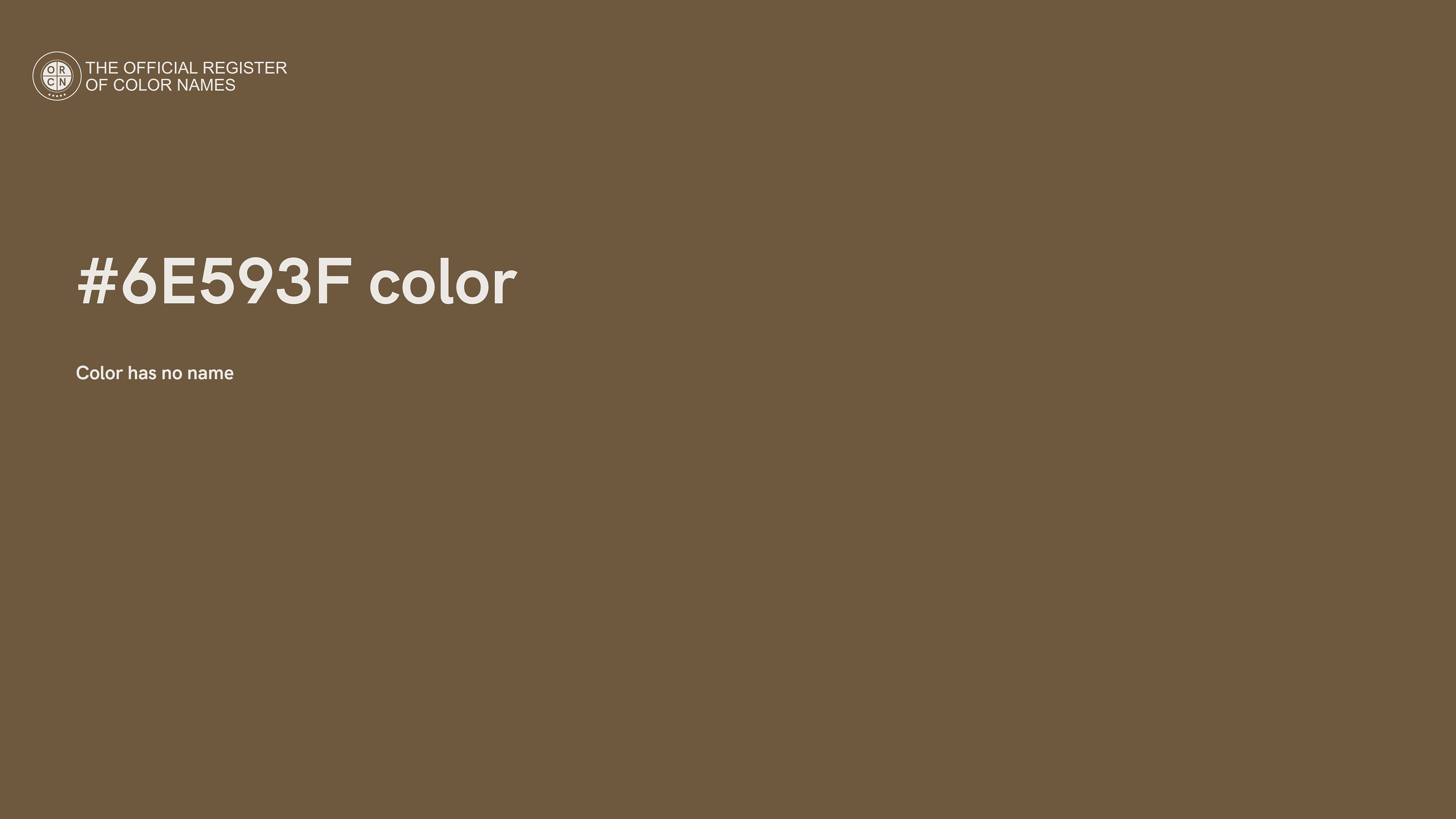 The digital color HEX #6E593F belongs to the Orange Color Family featuring Mild Saturation (Saturation Family) and Neutral (Brightness Family).