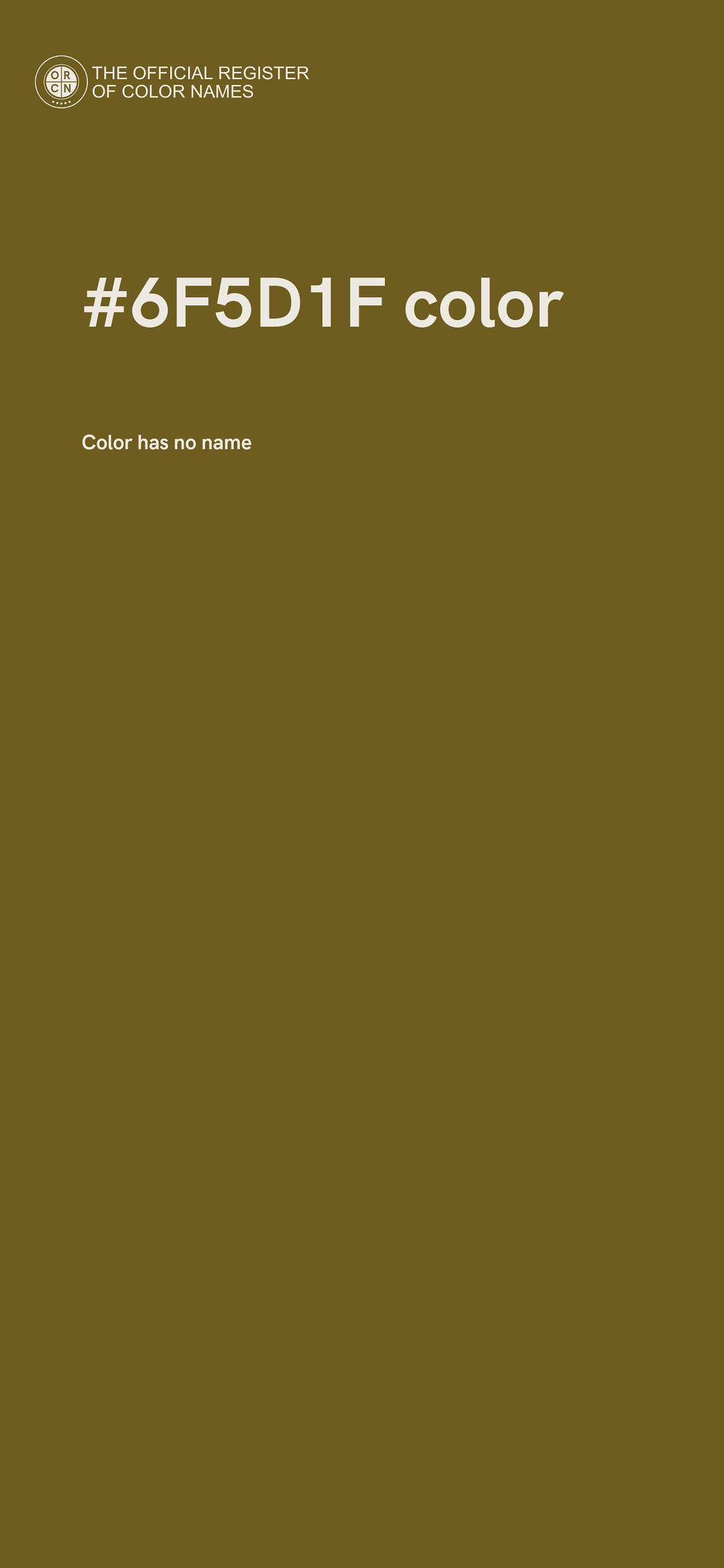 The digital color HEX #6F5D1F belongs to the Yellow Color Family featuring Moderate Saturation (Saturation Family) and Neutral (Brightness Family).