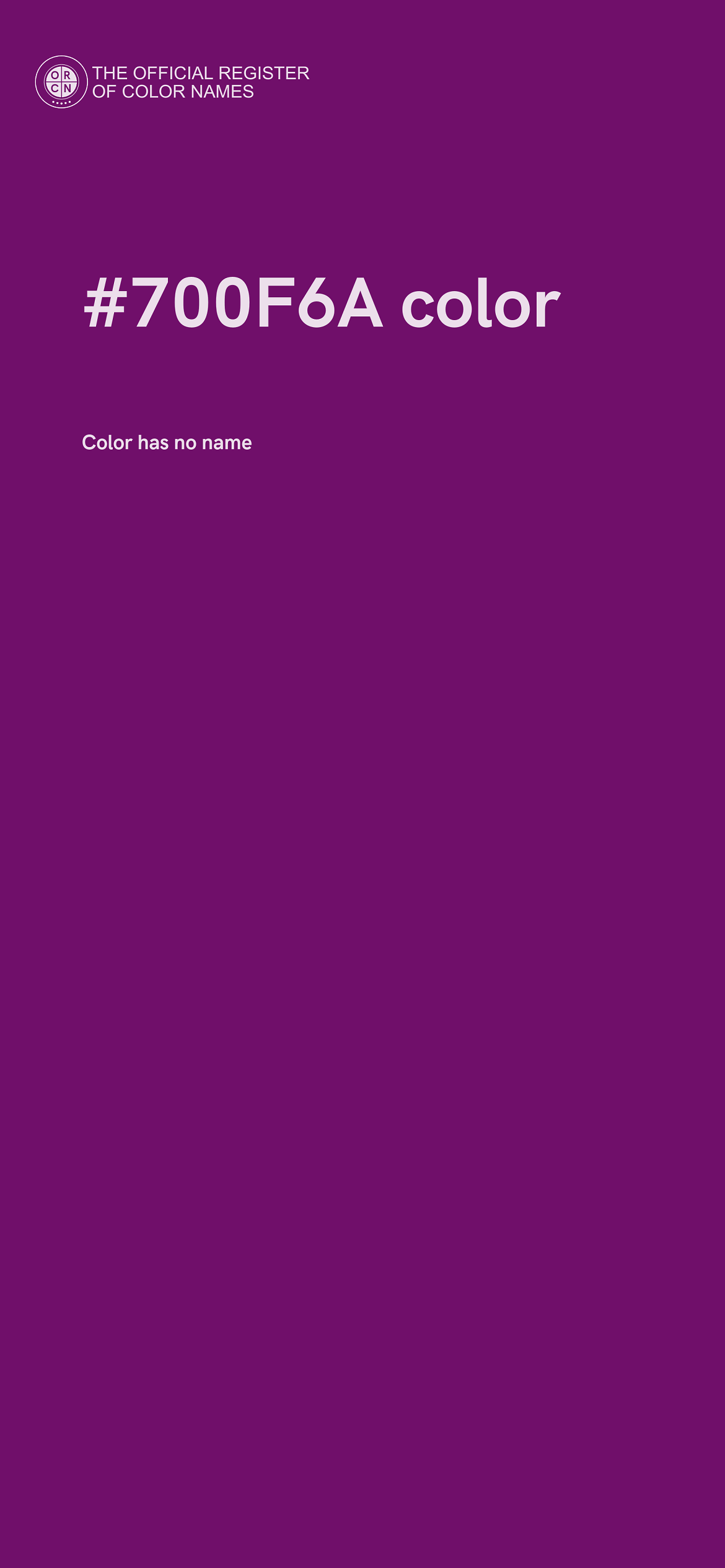 The digital color HEX #700F6A belongs to the Magenta Color Family featuring High Saturation (Saturation Family) and Neutral (Brightness Family).