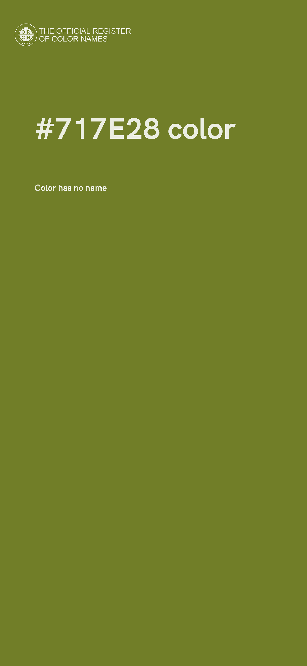 The digital color HEX #717E28 belongs to the Yellow Color Family featuring Moderate Saturation (Saturation Family) and Neutral (Brightness Family).
