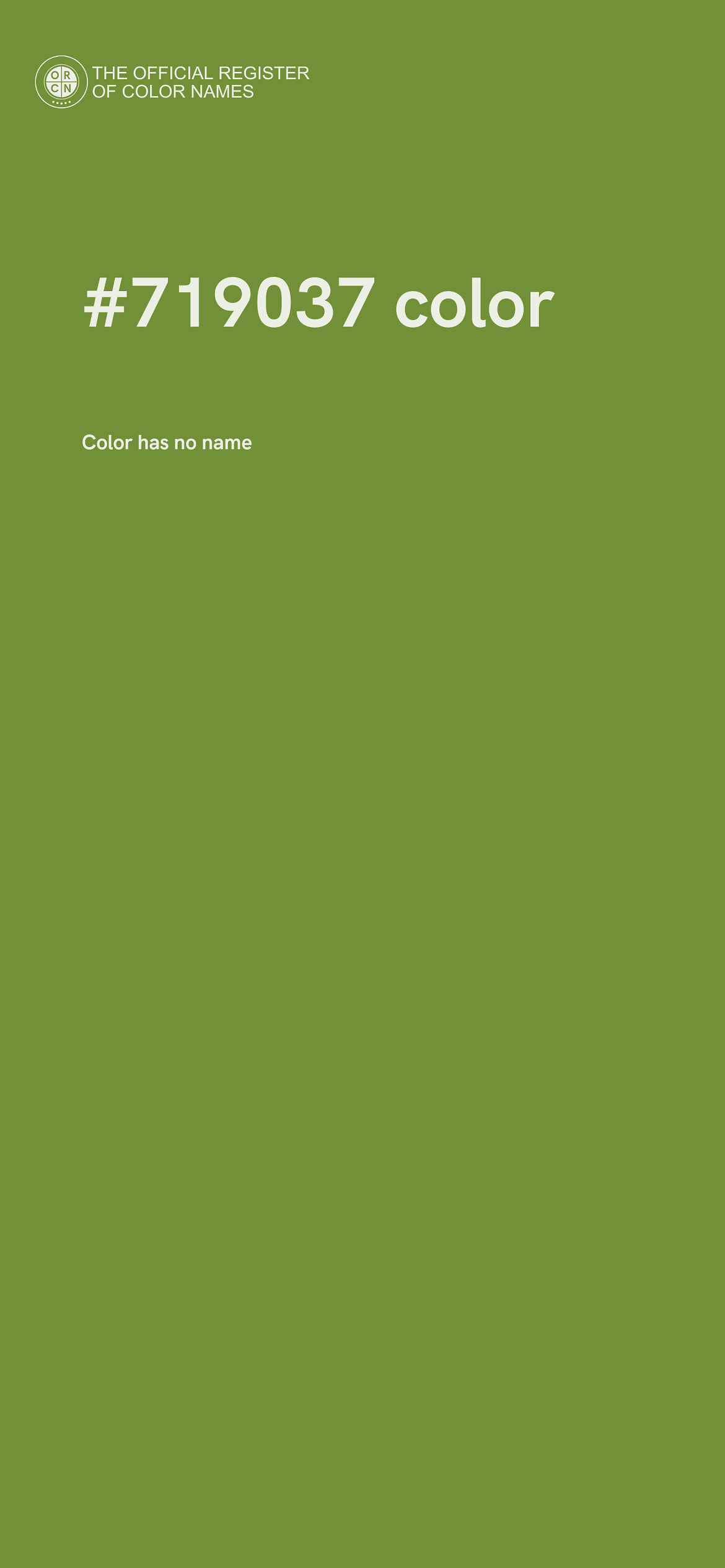The digital color HEX #719037 belongs to the Chartreuse Color Family featuring Moderate Saturation (Saturation Family) and Neutral (Brightness Family).