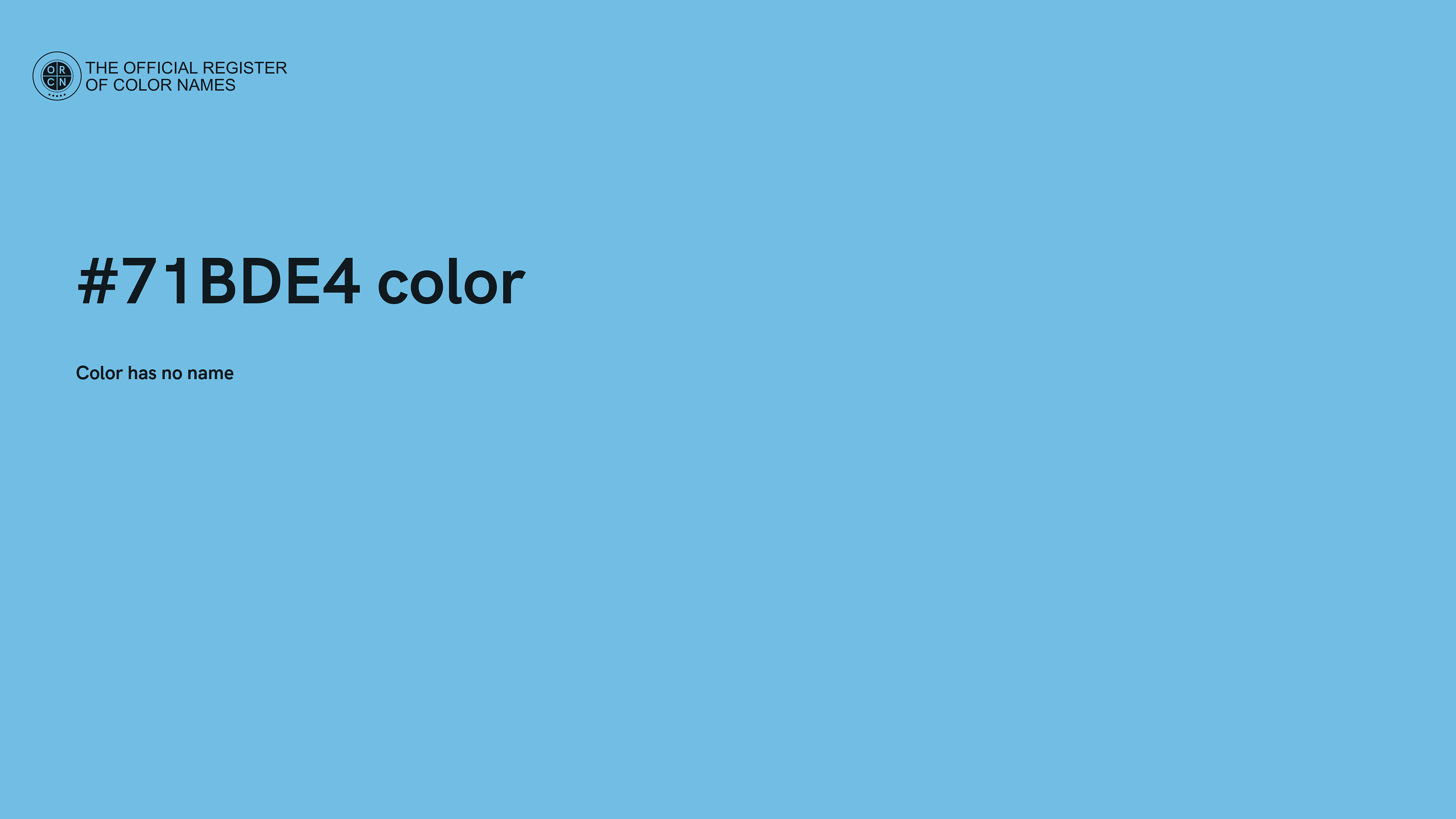 The digital color HEX #71BDE4 belongs to the Azure Color Family featuring High Saturation (Saturation Family) and Very Light (Brightness Family).