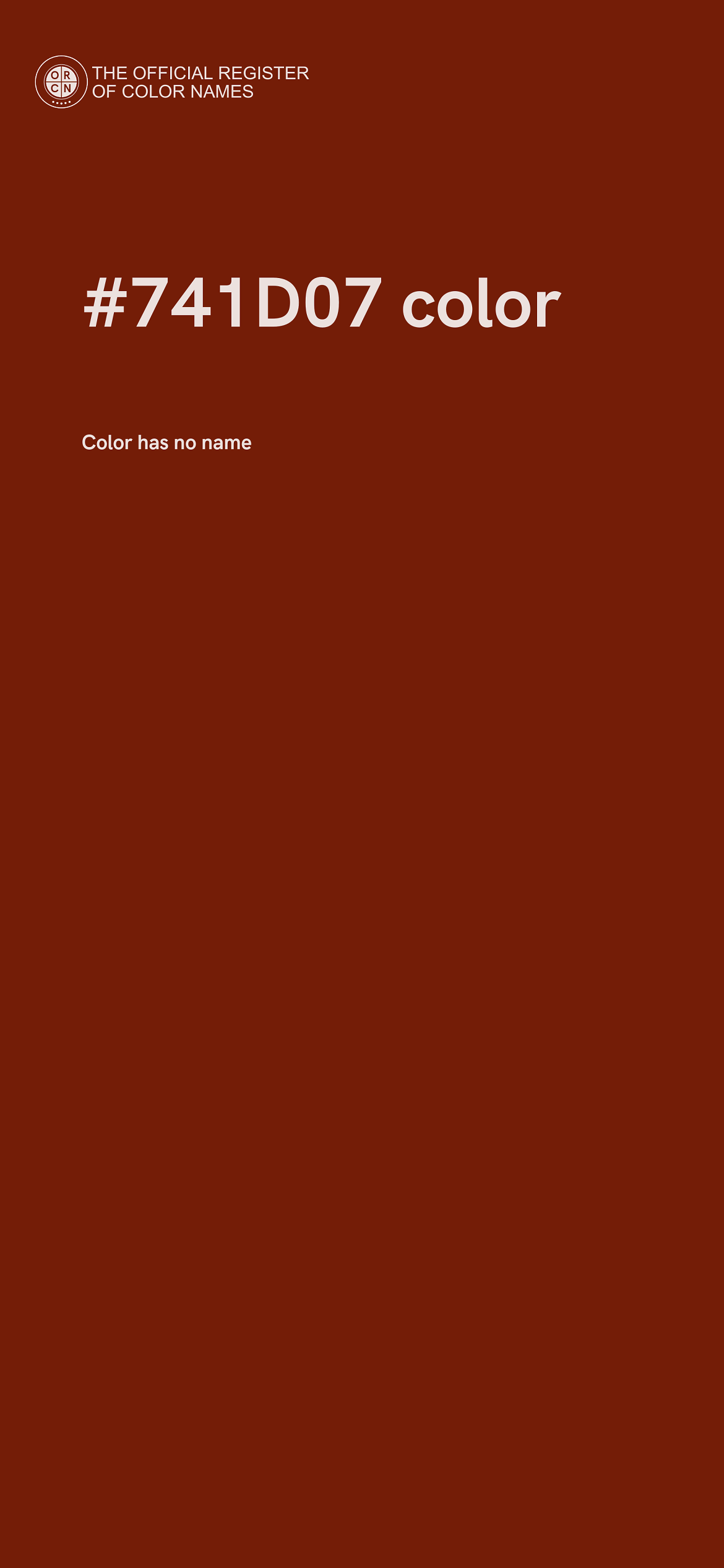 The digital color HEX #741D07 belongs to the Red Color Family featuring Full Saturation (Saturation Family) and Dark (Brightness Family).