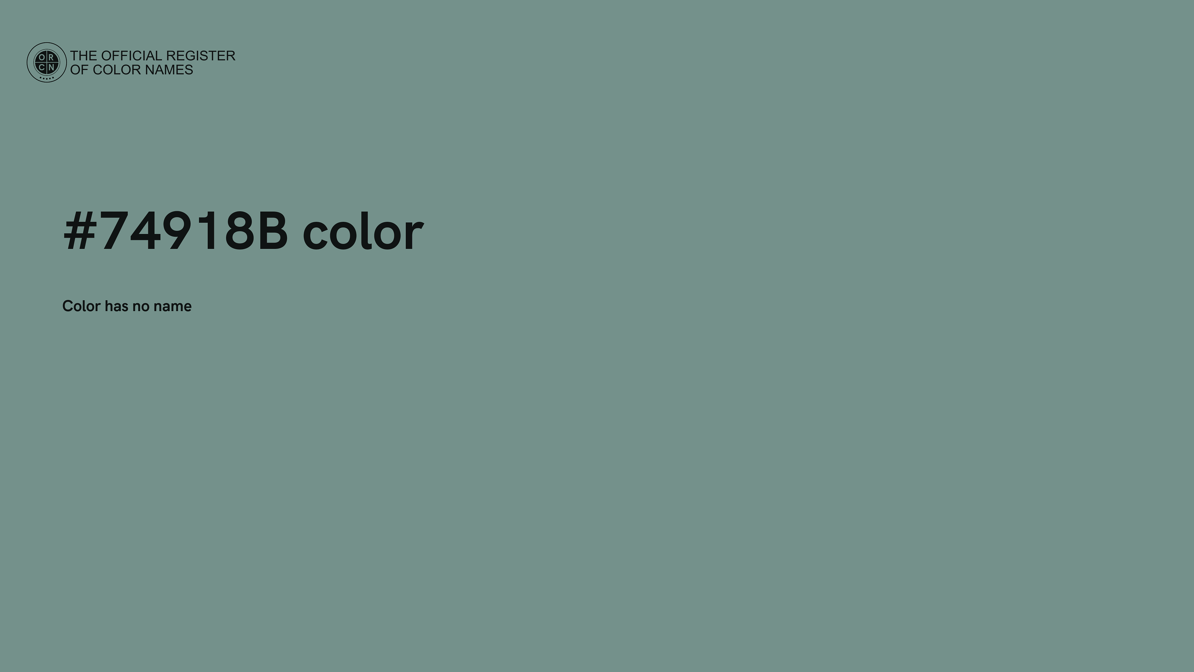 The digital color HEX #74918B belongs to the Cyan Color Family featuring Low Saturation (Saturation Family) and Light (Brightness Family).