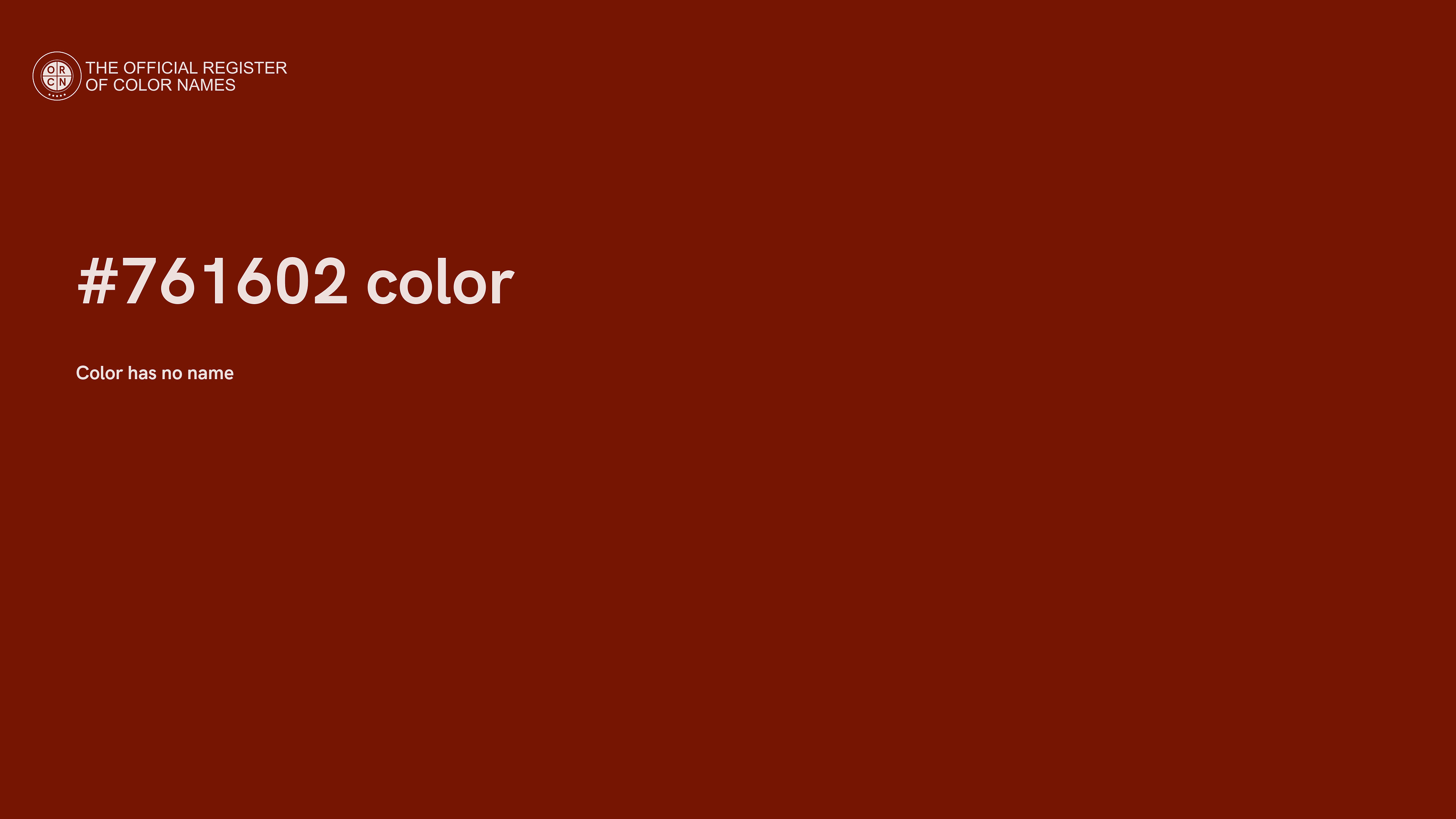 The digital color HEX #761602 belongs to the Red Color Family featuring Full Saturation (Saturation Family) and Dark (Brightness Family).