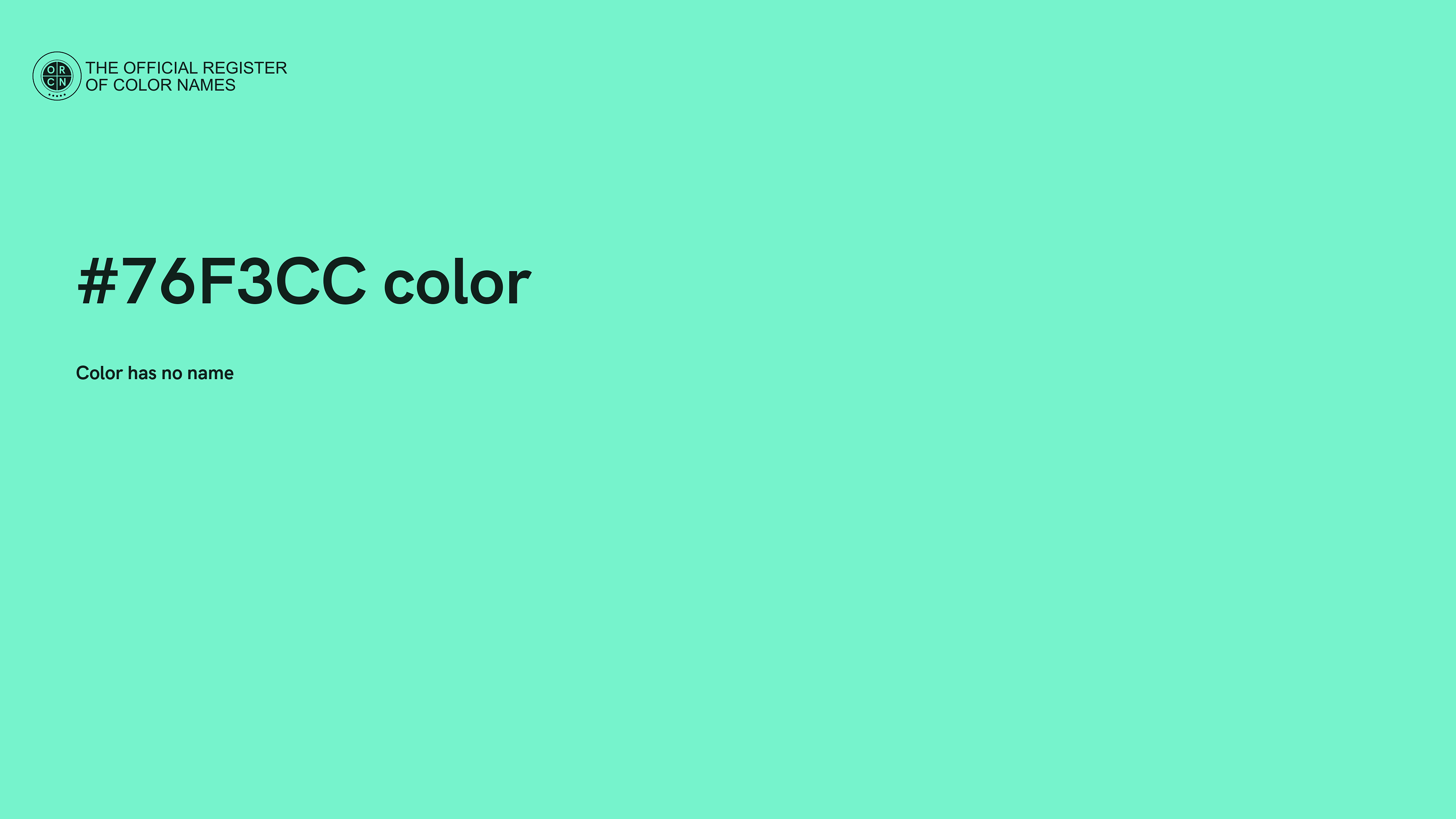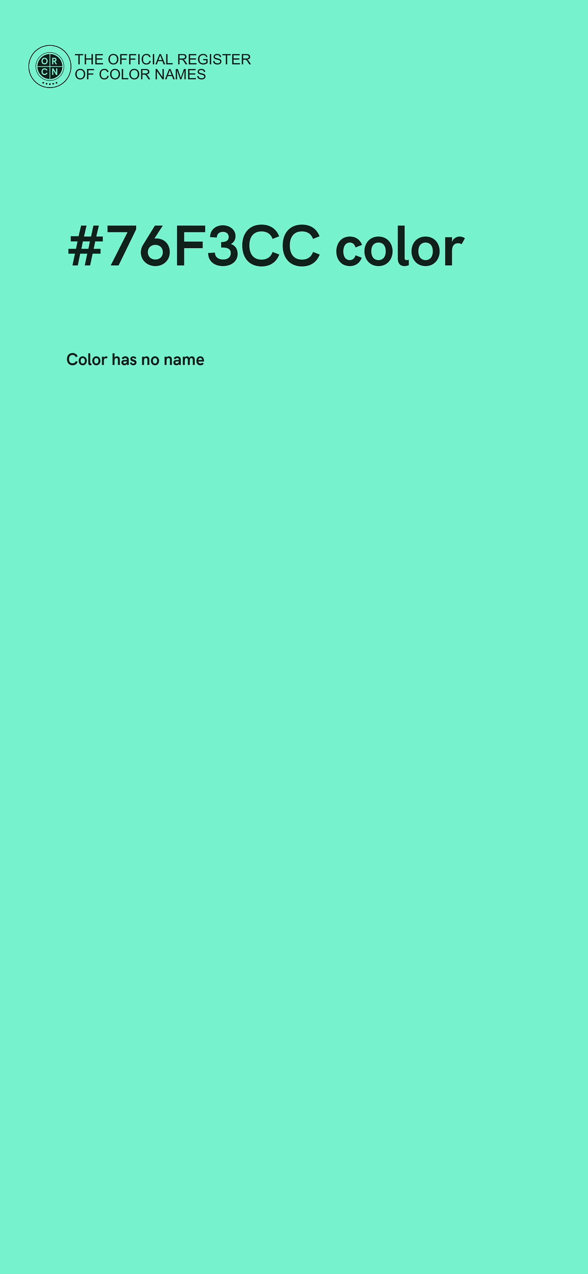 The digital color HEX #76F3CC belongs to the Spring Green Color Family featuring High Saturation (Saturation Family) and Very Light (Brightness Family).