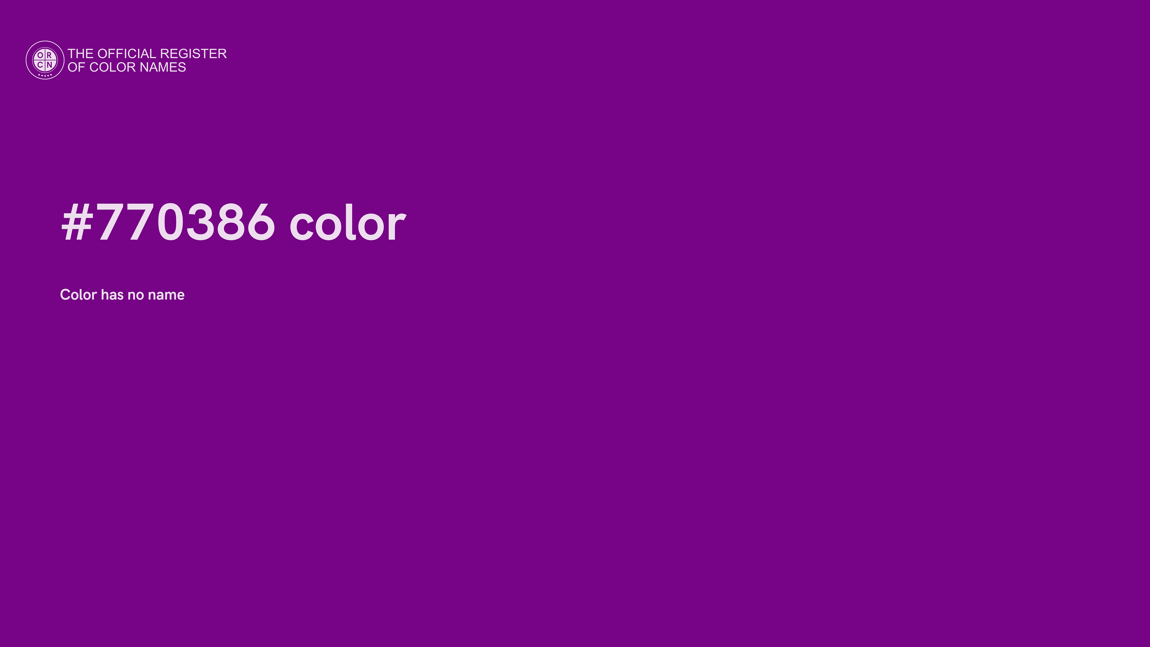 The digital color HEX #770386 belongs to the Magenta Color Family featuring Full Saturation (Saturation Family) and Neutral (Brightness Family).