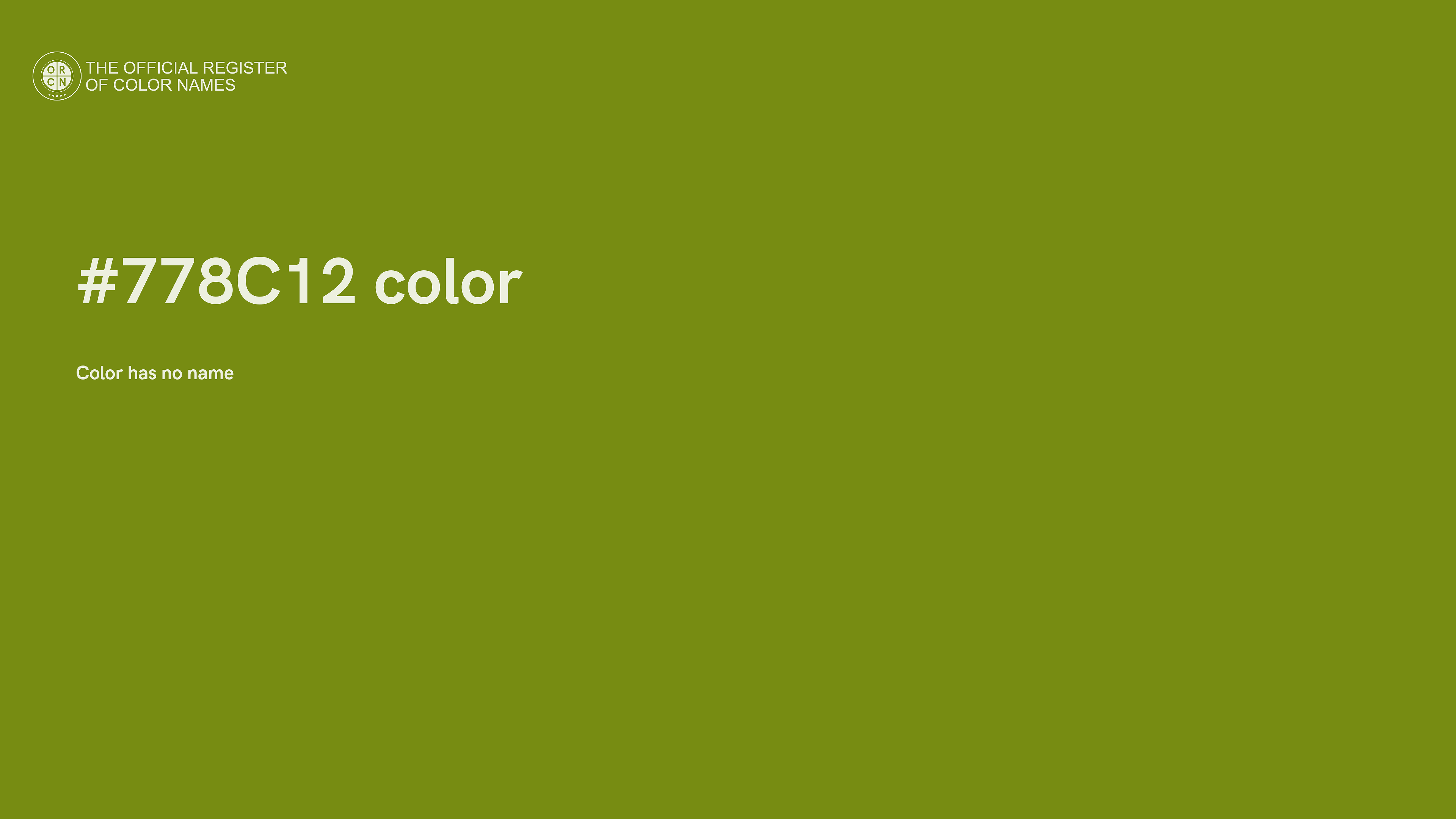 The digital color HEX #778C12 belongs to the Yellow Color Family featuring High Saturation (Saturation Family) and Neutral (Brightness Family).