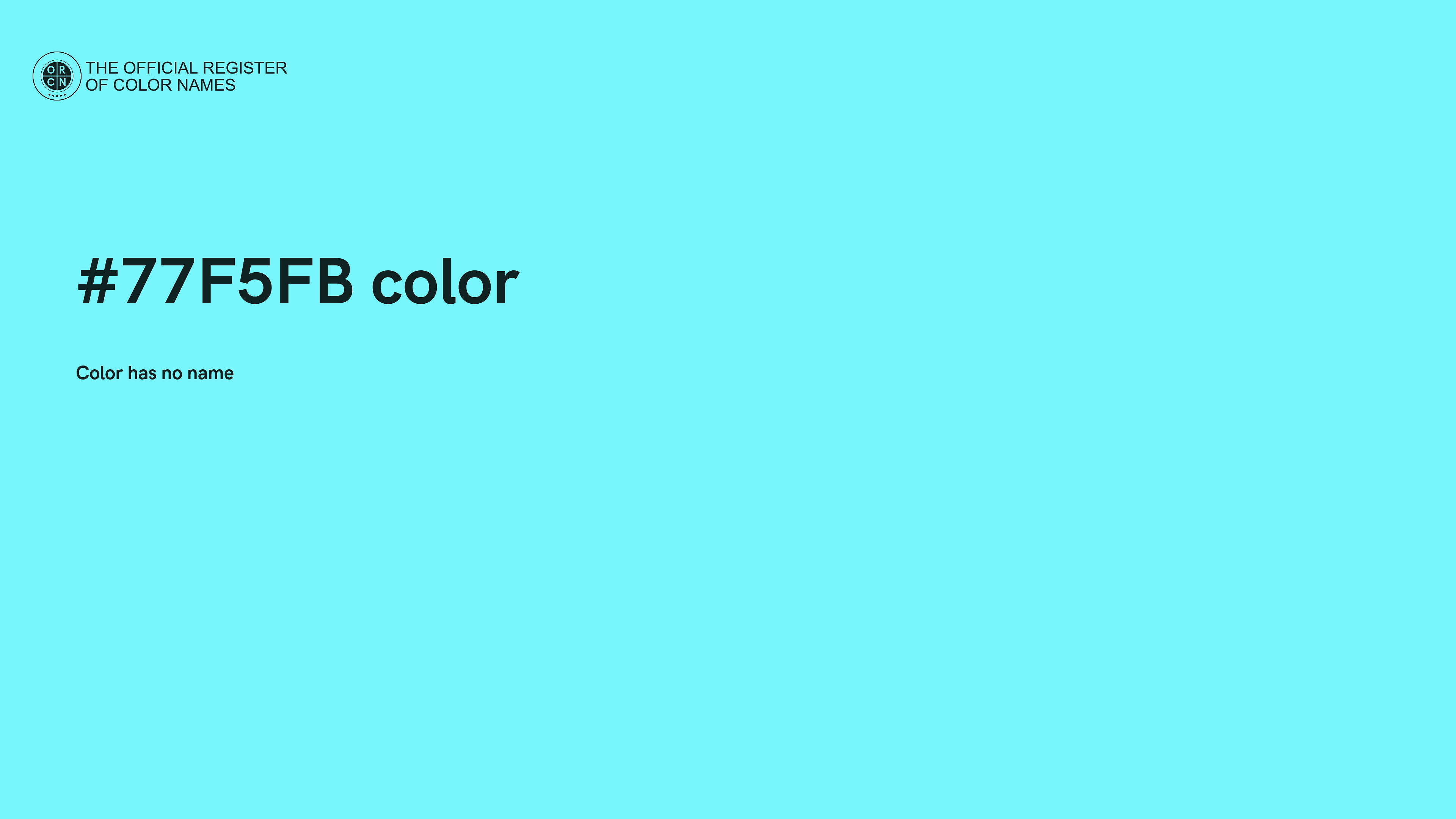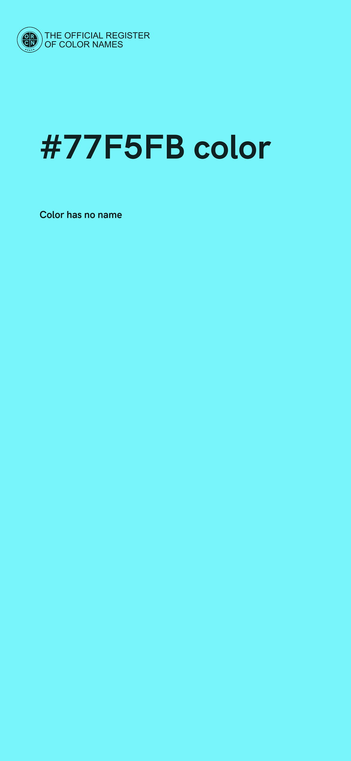 The digital color HEX #77F5FB belongs to the Cyan Color Family featuring Full Saturation (Saturation Family) and Very Light (Brightness Family).