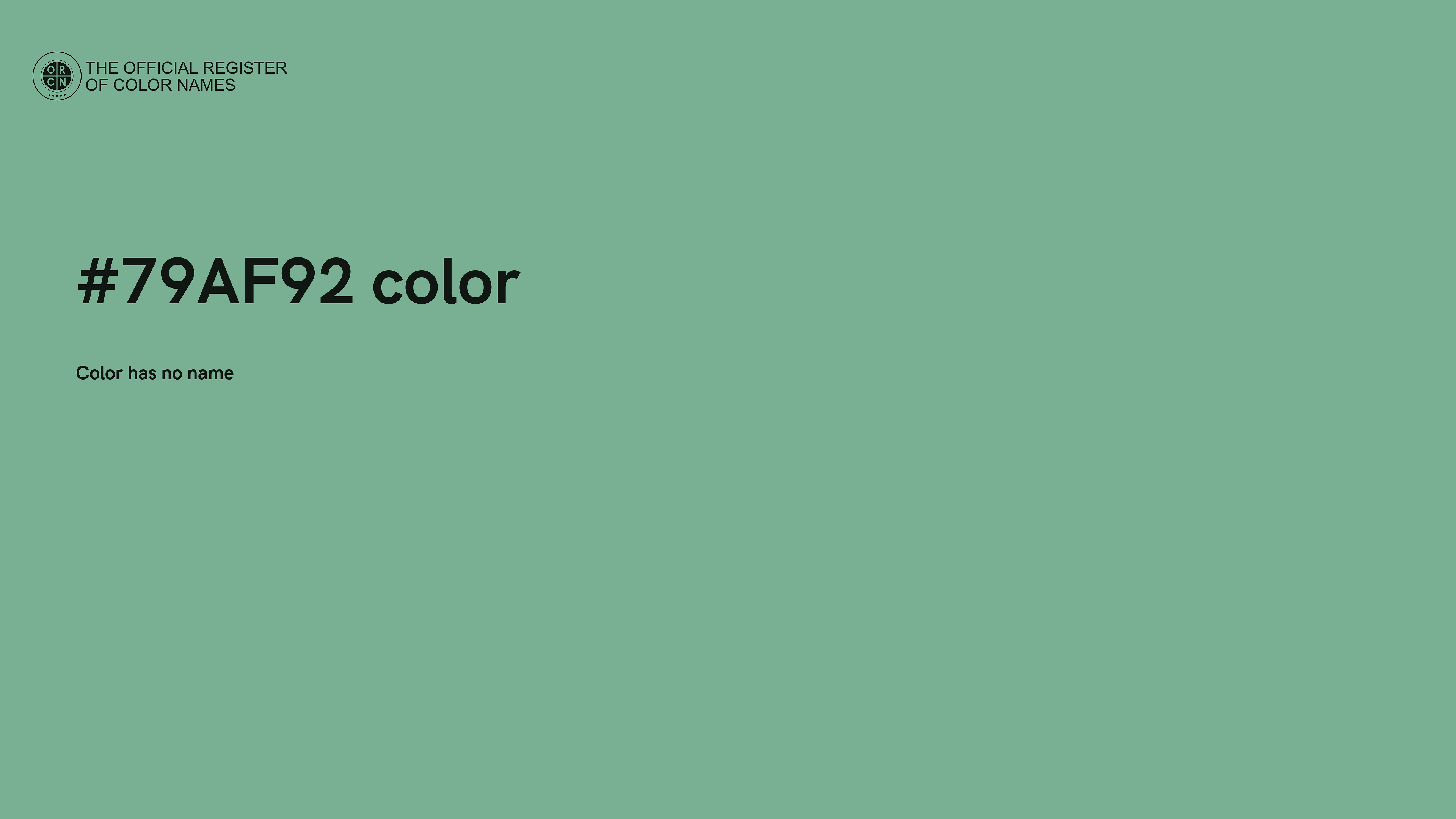 The digital color HEX #79AF92 belongs to the Spring Green Color Family featuring Mild Saturation (Saturation Family) and Light (Brightness Family).