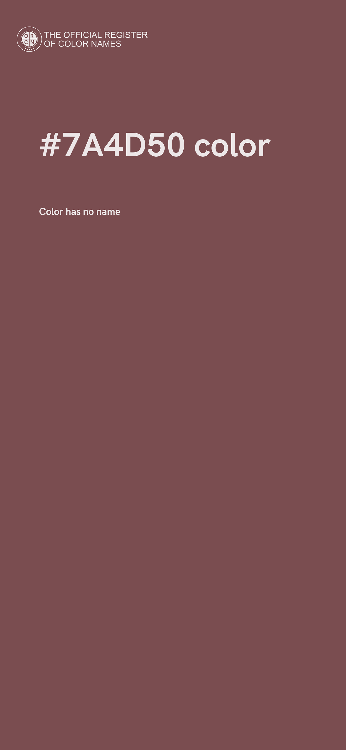 The digital color HEX #7A4D50 belongs to the Red Color Family featuring Low Saturation (Saturation Family) and Neutral (Brightness Family).