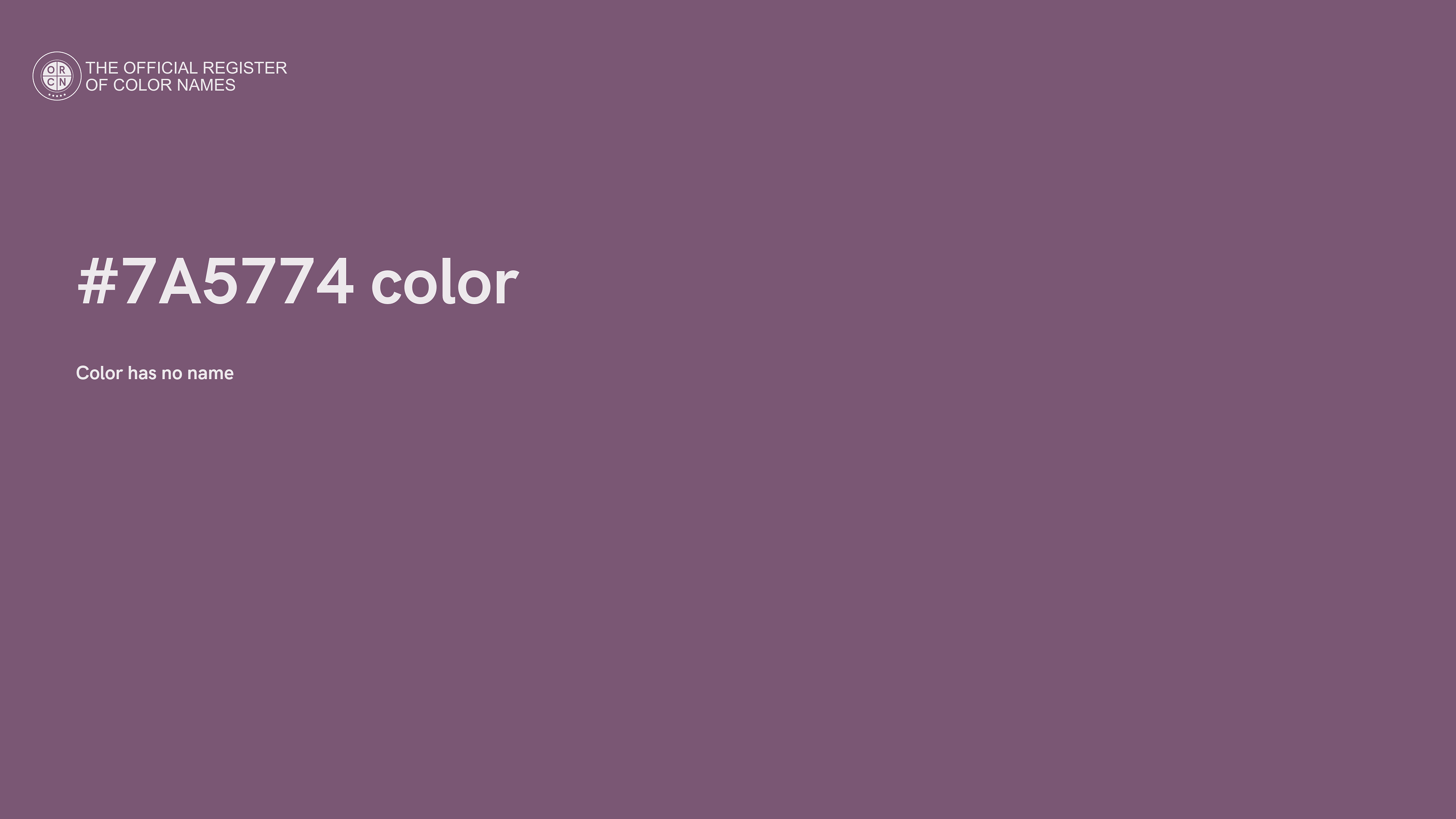 The digital color HEX #7A5774 belongs to the Magenta Color Family featuring Low Saturation (Saturation Family) and Light (Brightness Family).