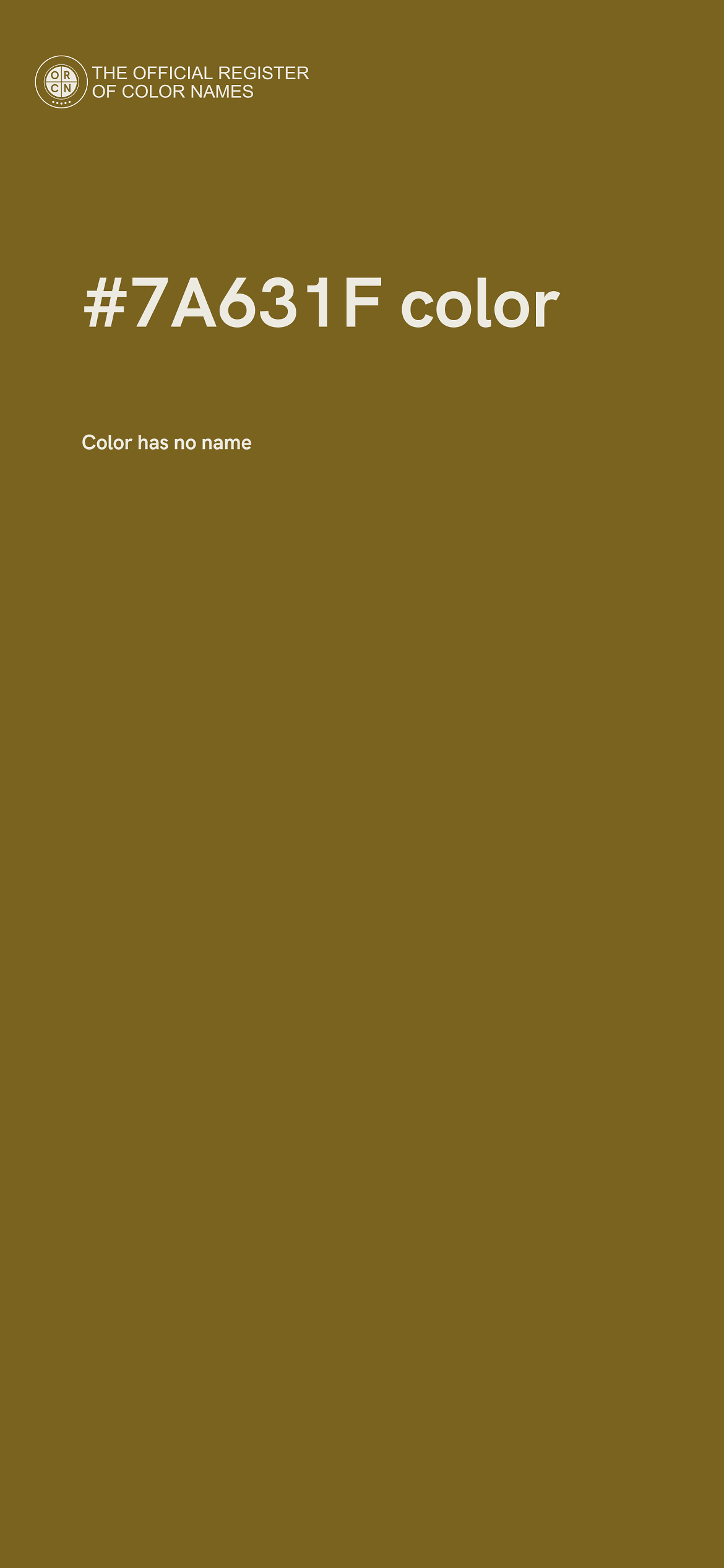 The digital color HEX #7A631F belongs to the Yellow Color Family featuring Moderate Saturation (Saturation Family) and Neutral (Brightness Family).