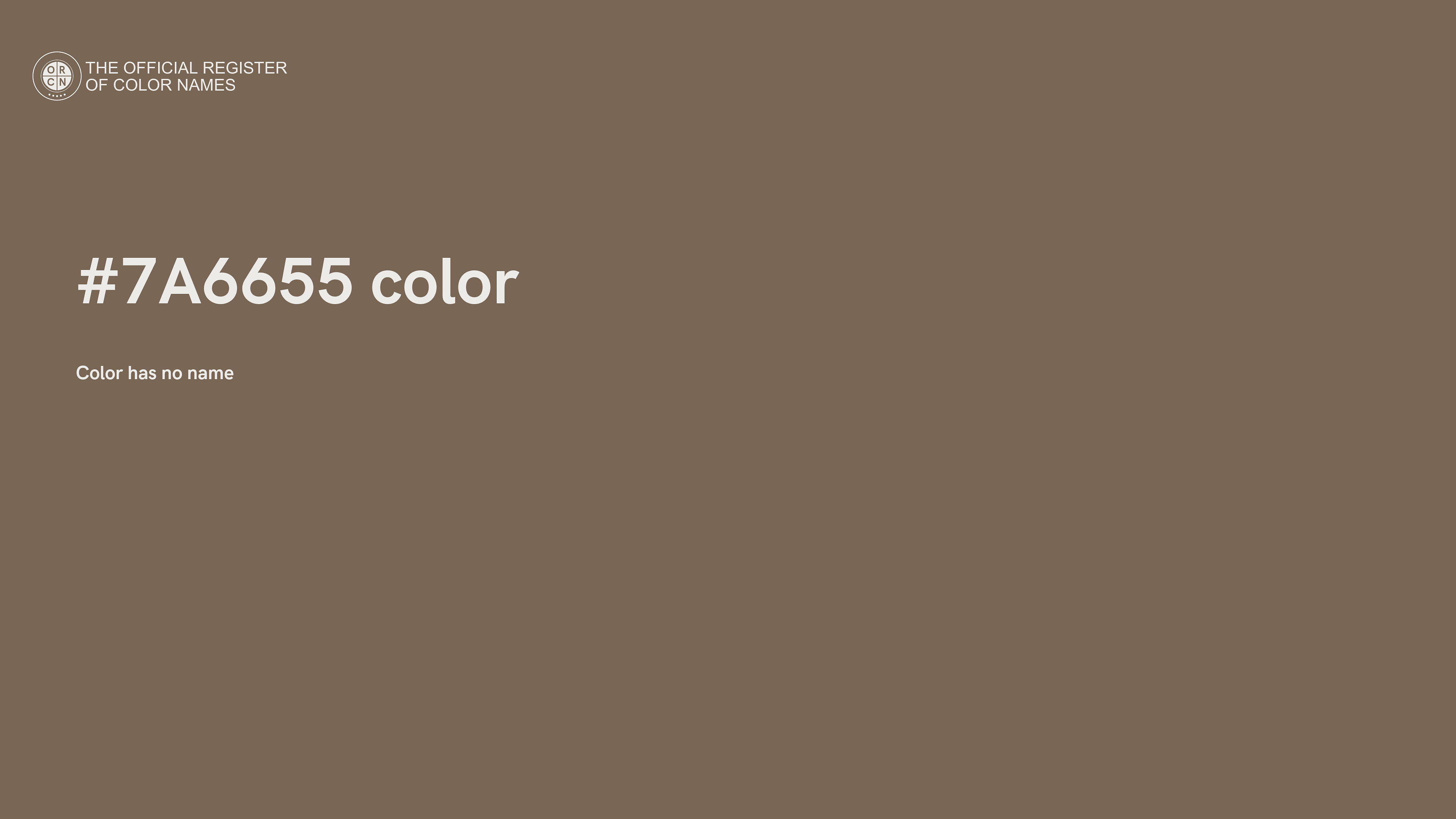The digital color HEX #7A6655 belongs to the Orange Color Family featuring Low Saturation (Saturation Family) and Light (Brightness Family).