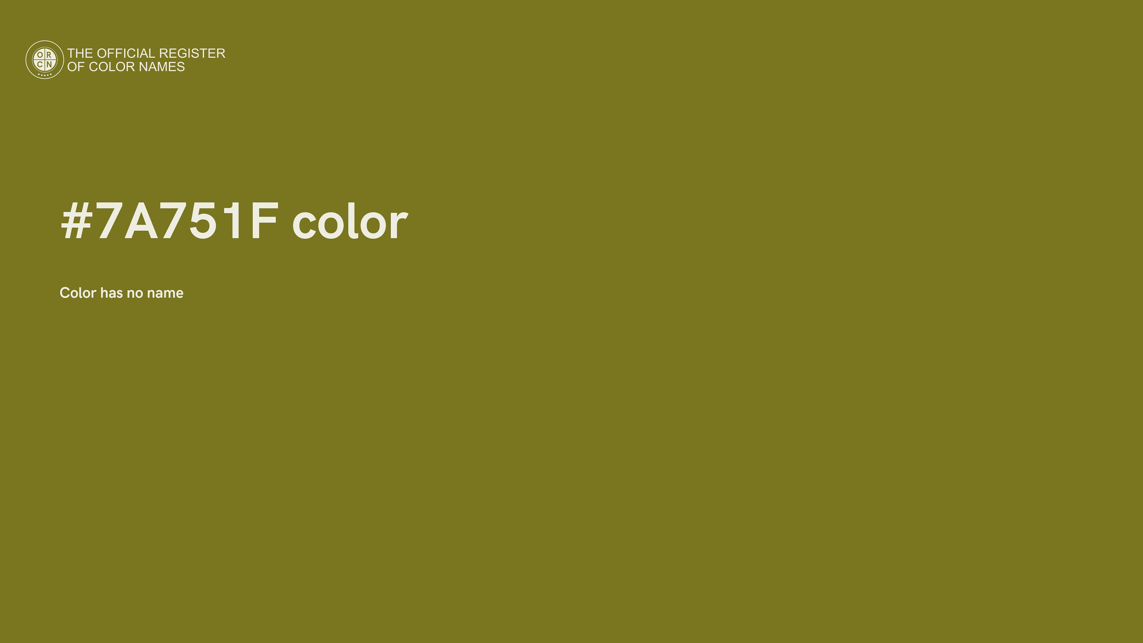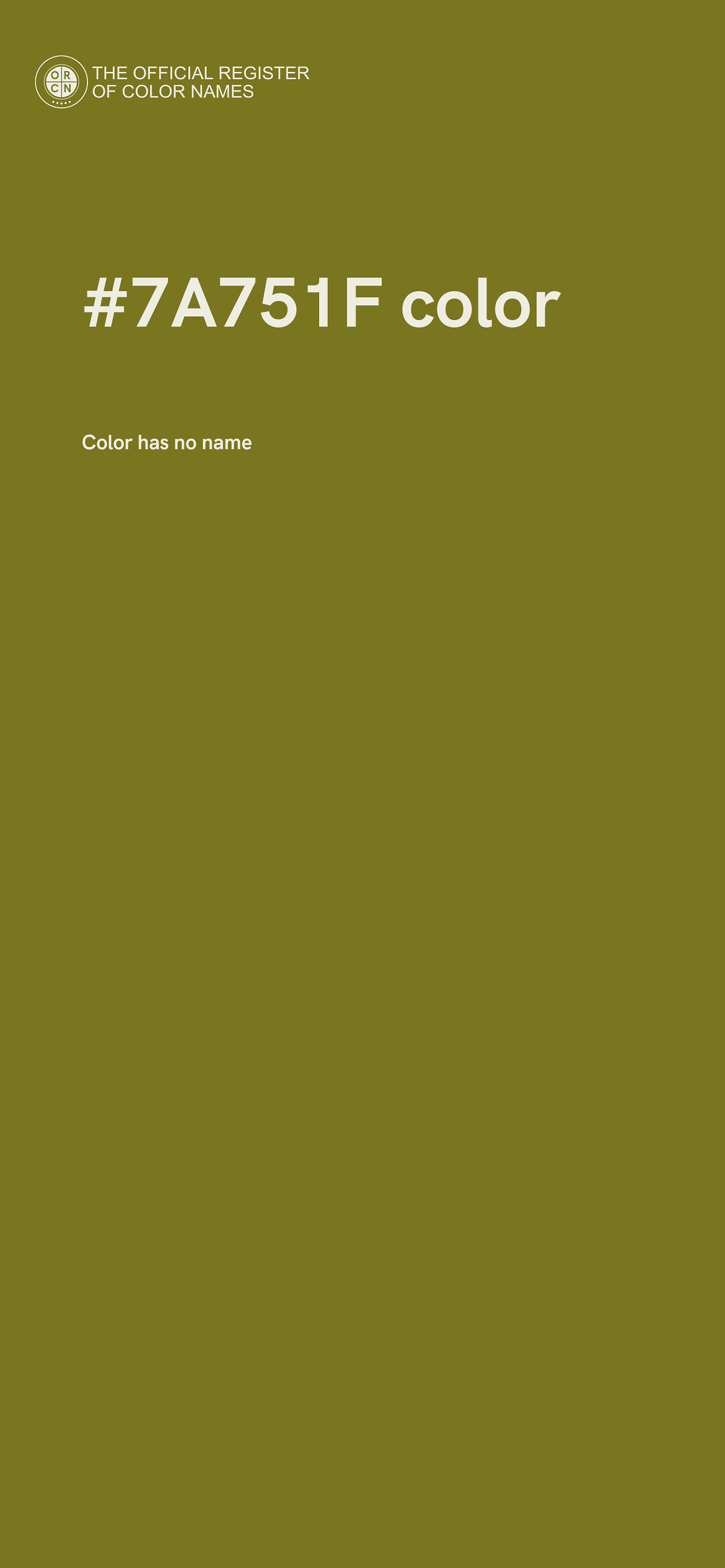 The digital color HEX #7A751F belongs to the Yellow Color Family featuring Moderate Saturation (Saturation Family) and Neutral (Brightness Family).