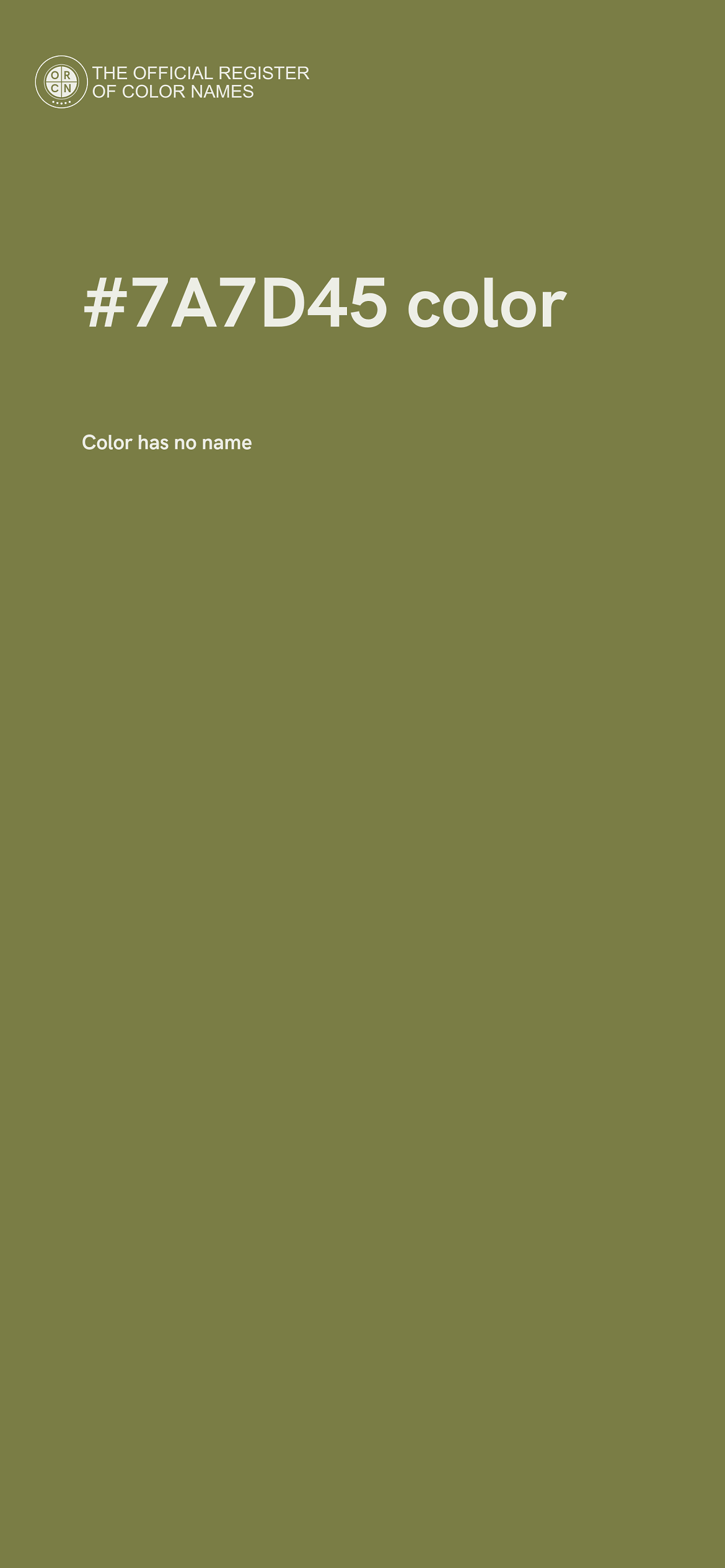 The digital color HEX #7A7D45 belongs to the Yellow Color Family featuring Mild Saturation (Saturation Family) and Neutral (Brightness Family).