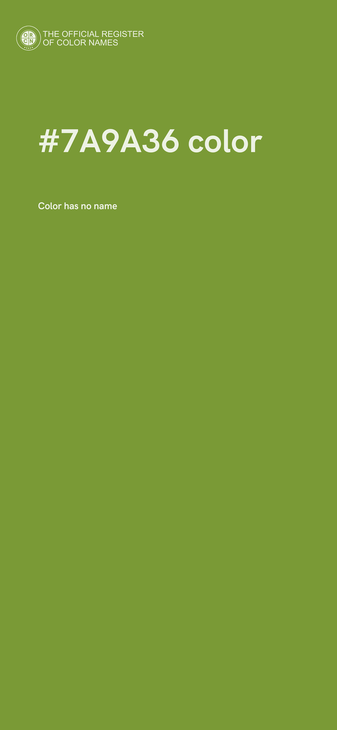 The digital color HEX #7A9A36 belongs to the Chartreuse Color Family featuring Moderate Saturation (Saturation Family) and Light (Brightness Family).