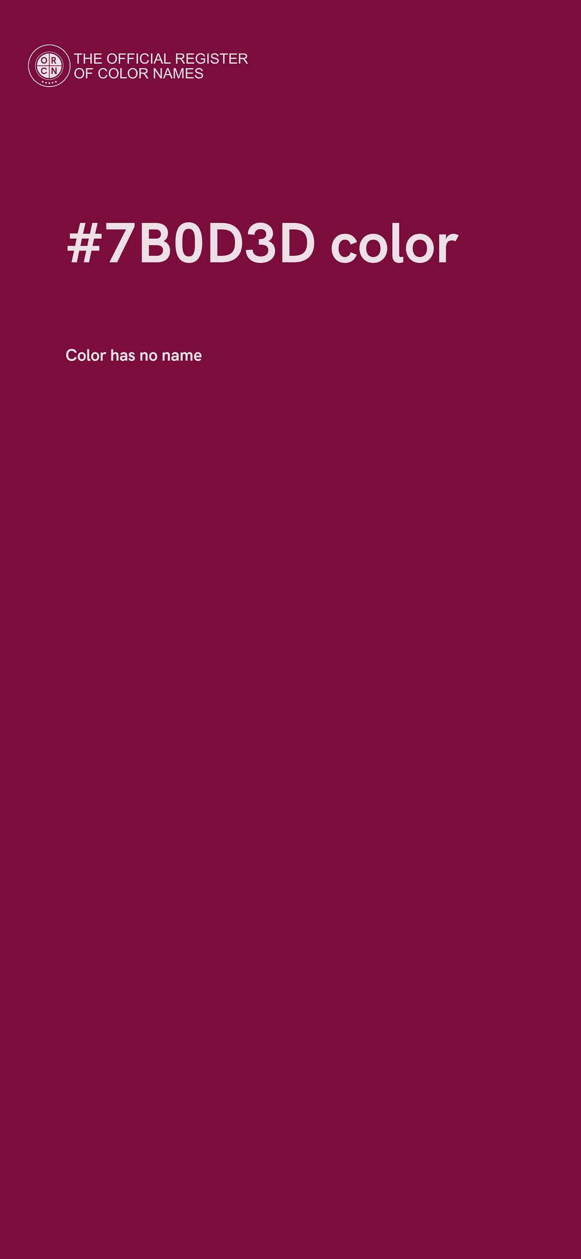 The digital color HEX #7B0D3D belongs to the Rose Color Family featuring High Saturation (Saturation Family) and Neutral (Brightness Family).