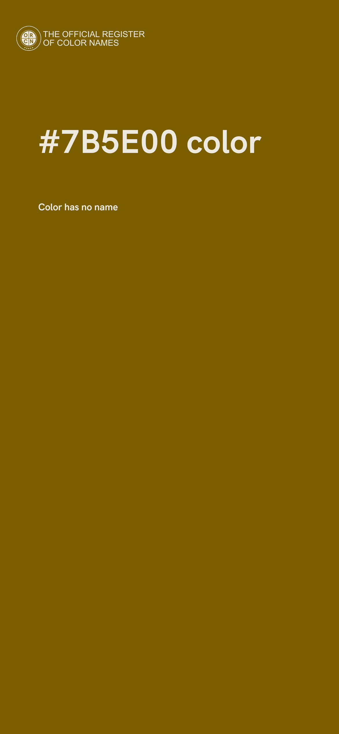 The digital color HEX #7B5E00 belongs to the Yellow Color Family featuring Full Saturation (Saturation Family) and Dark (Brightness Family).