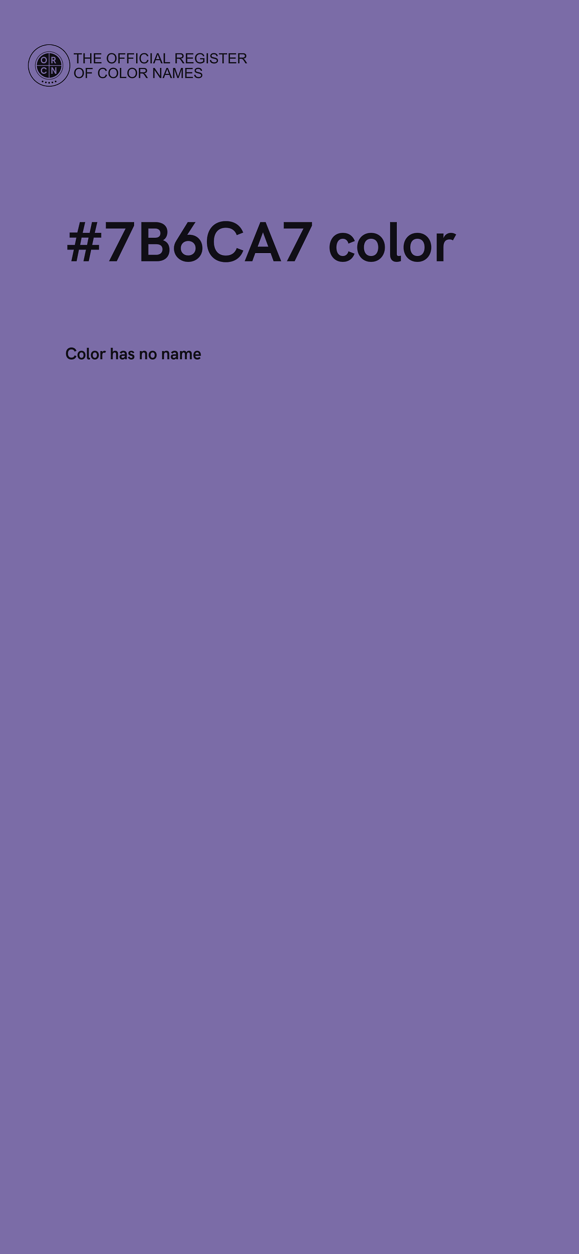 The digital color HEX #7B6CA7 belongs to the Violet Color Family featuring Mild Saturation (Saturation Family) and Light (Brightness Family).