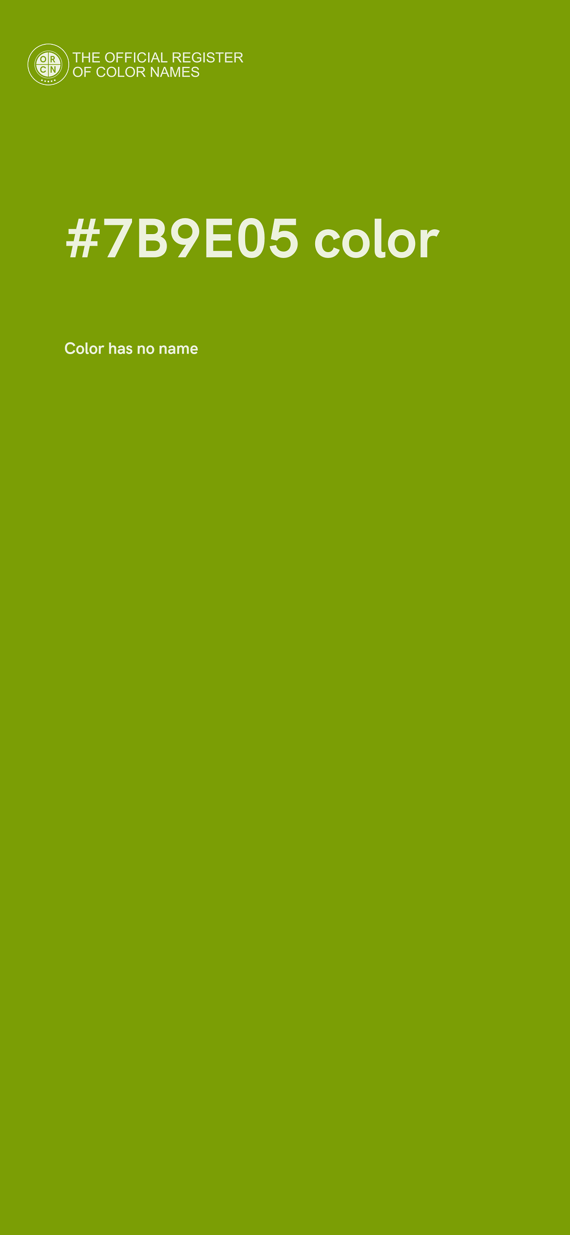 The digital color HEX #7B9E05 belongs to the Yellow Color Family featuring Full Saturation (Saturation Family) and Neutral (Brightness Family).