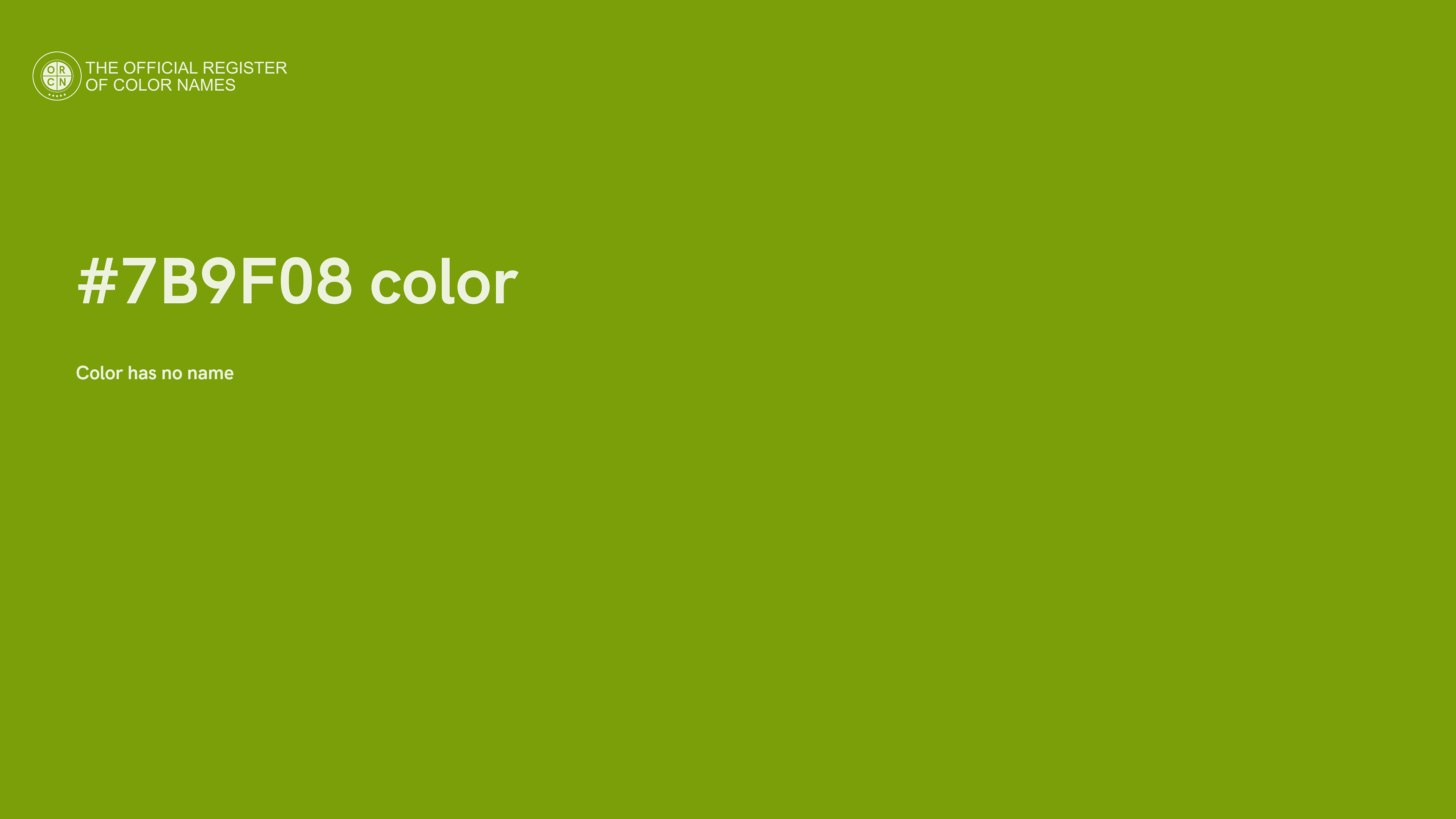 The digital color HEX #7B9F08 belongs to the Yellow Color Family featuring Full Saturation (Saturation Family) and Neutral (Brightness Family).