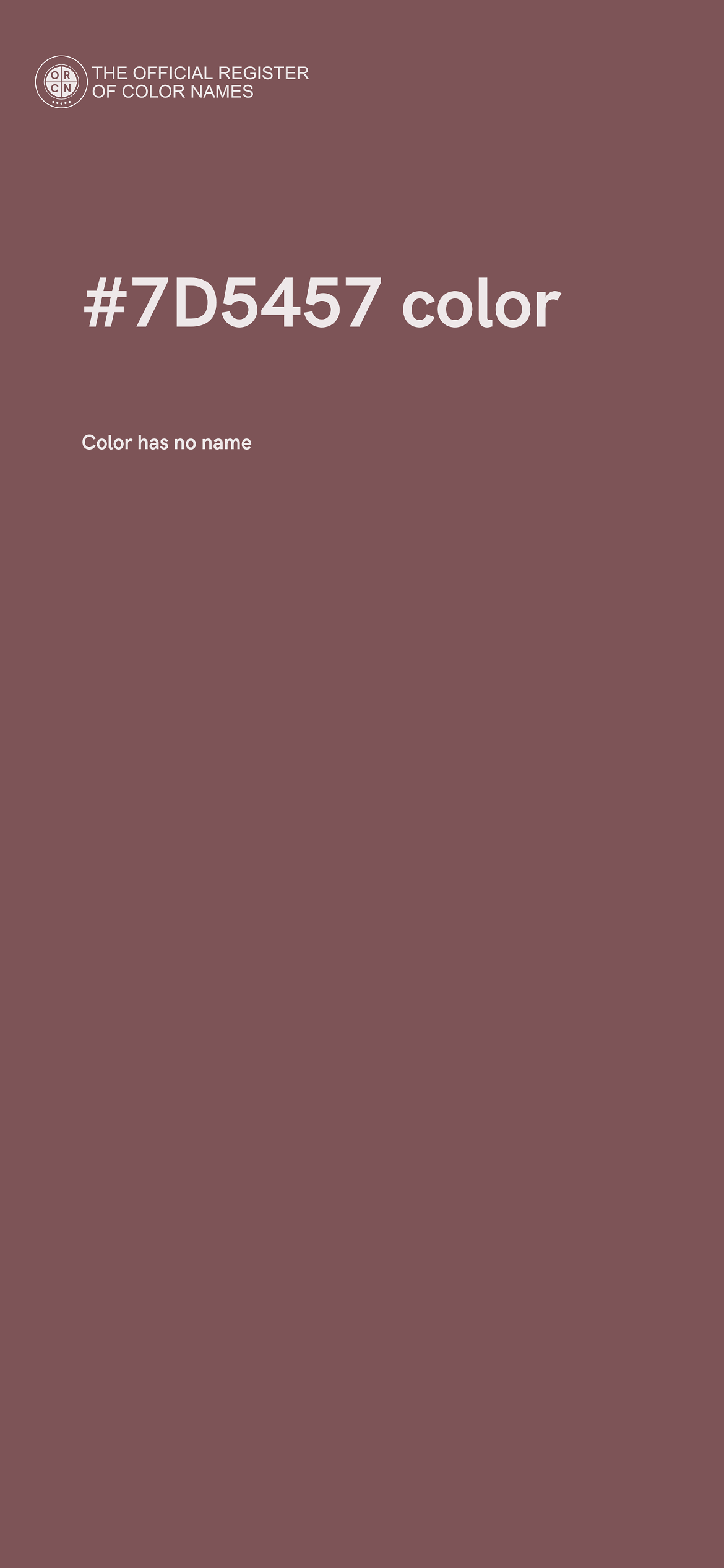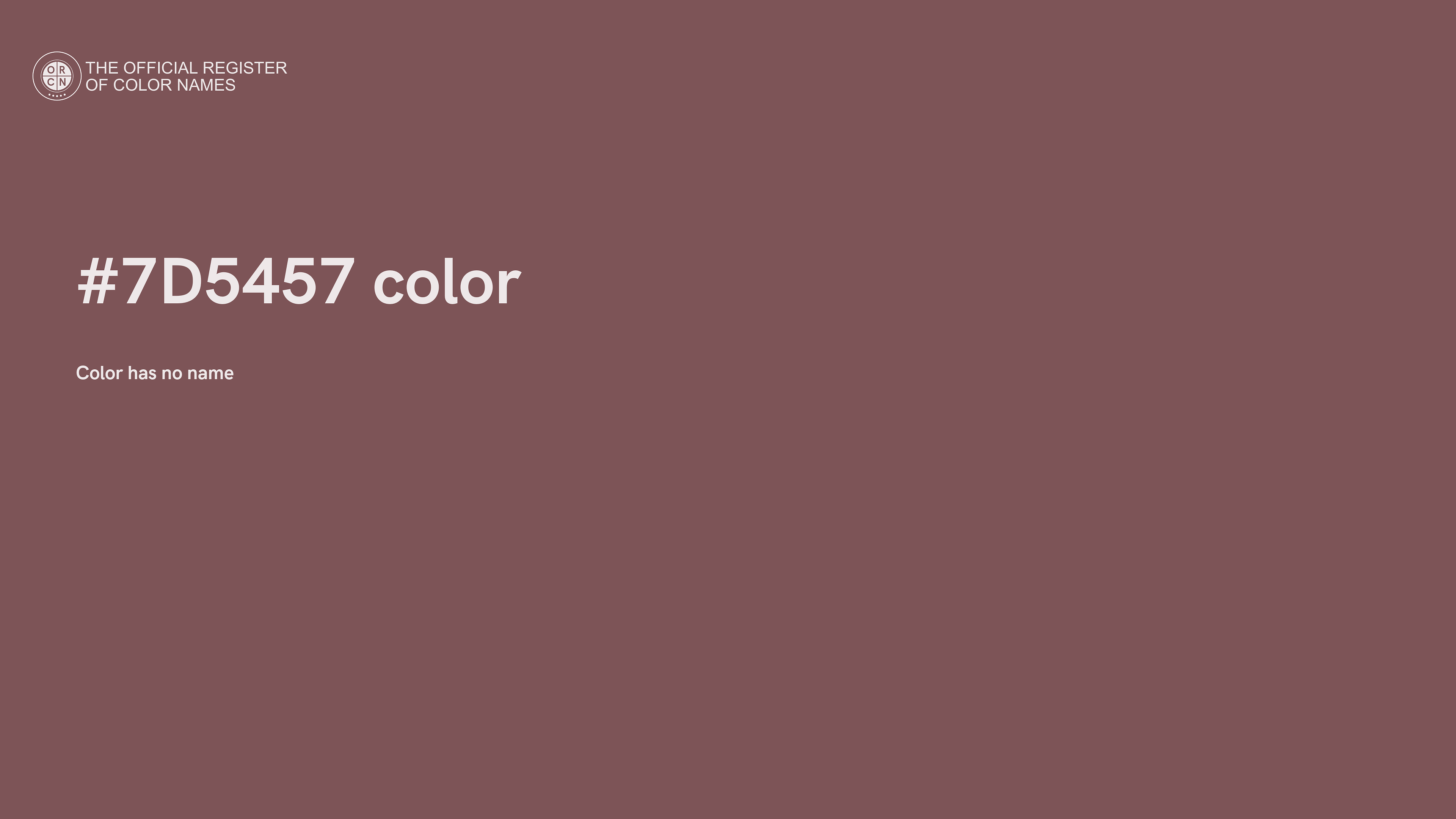 The digital color HEX #7D5457 belongs to the Red Color Family featuring Low Saturation (Saturation Family) and Light (Brightness Family).