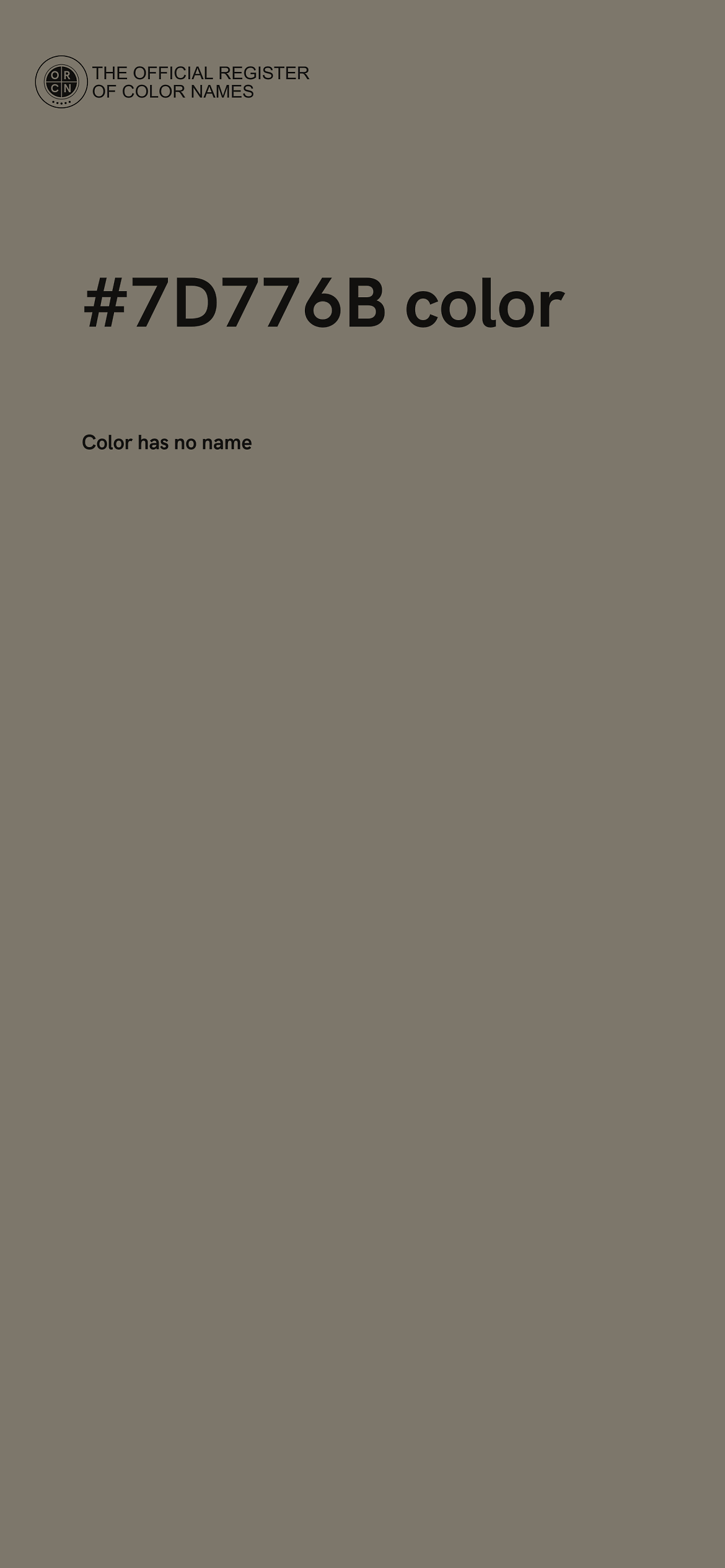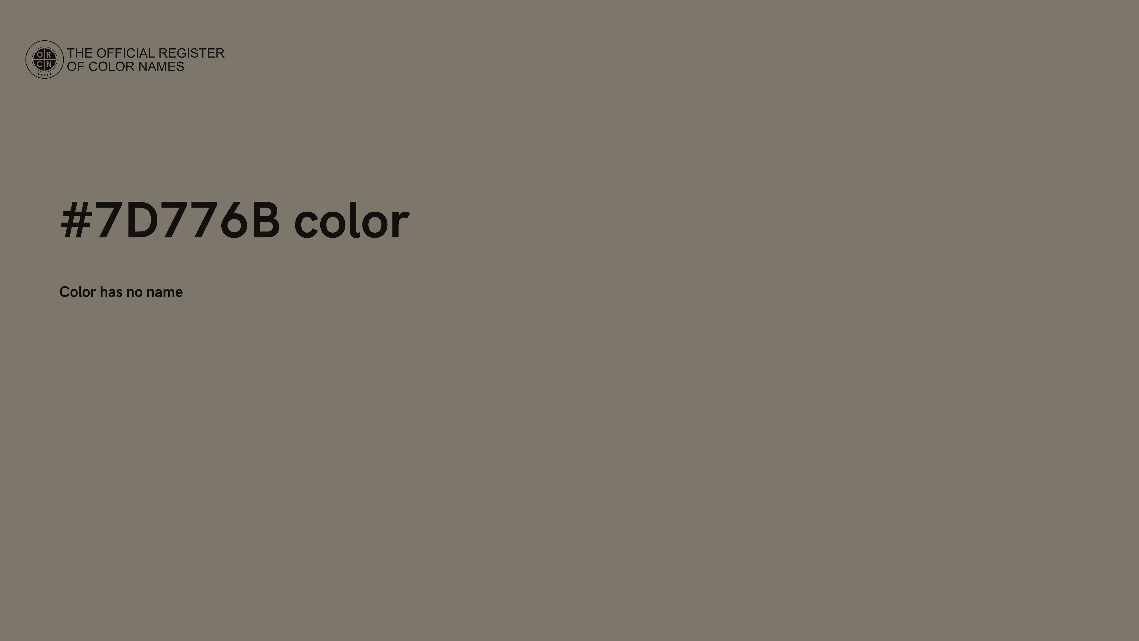 The digital color HEX #7D776B belongs to the Orange Color Family featuring Desaturated (Saturation Family) and Light (Brightness Family).