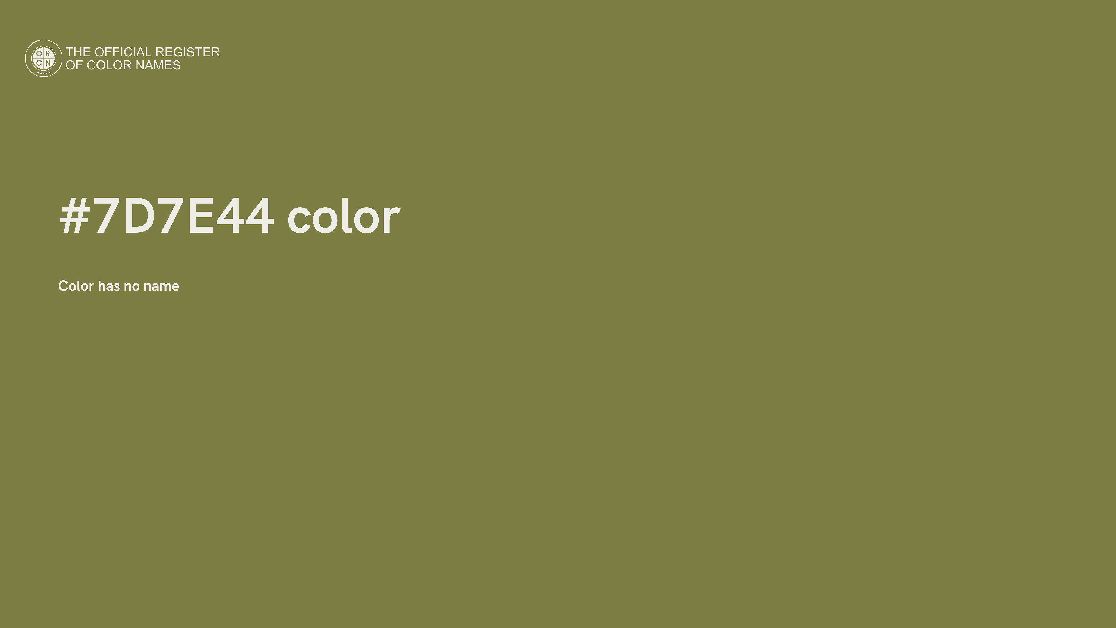 The digital color HEX #7D7E44 belongs to the Yellow Color Family featuring Mild Saturation (Saturation Family) and Neutral (Brightness Family).